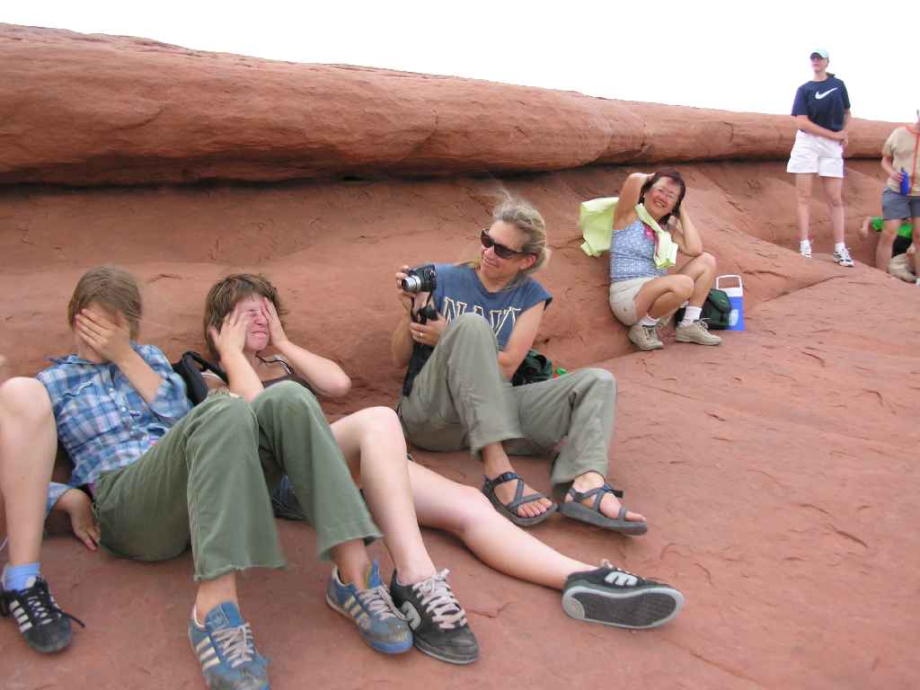 Immediately after the first picture was taken, a very strong wind hit, and hit hard. Small kids were at risk of being knocked off the ledges and down the cliffs of the approach route. The sand in the wind was very uncomfortabe, as modeled by this group!