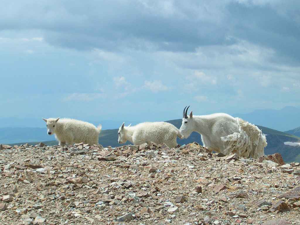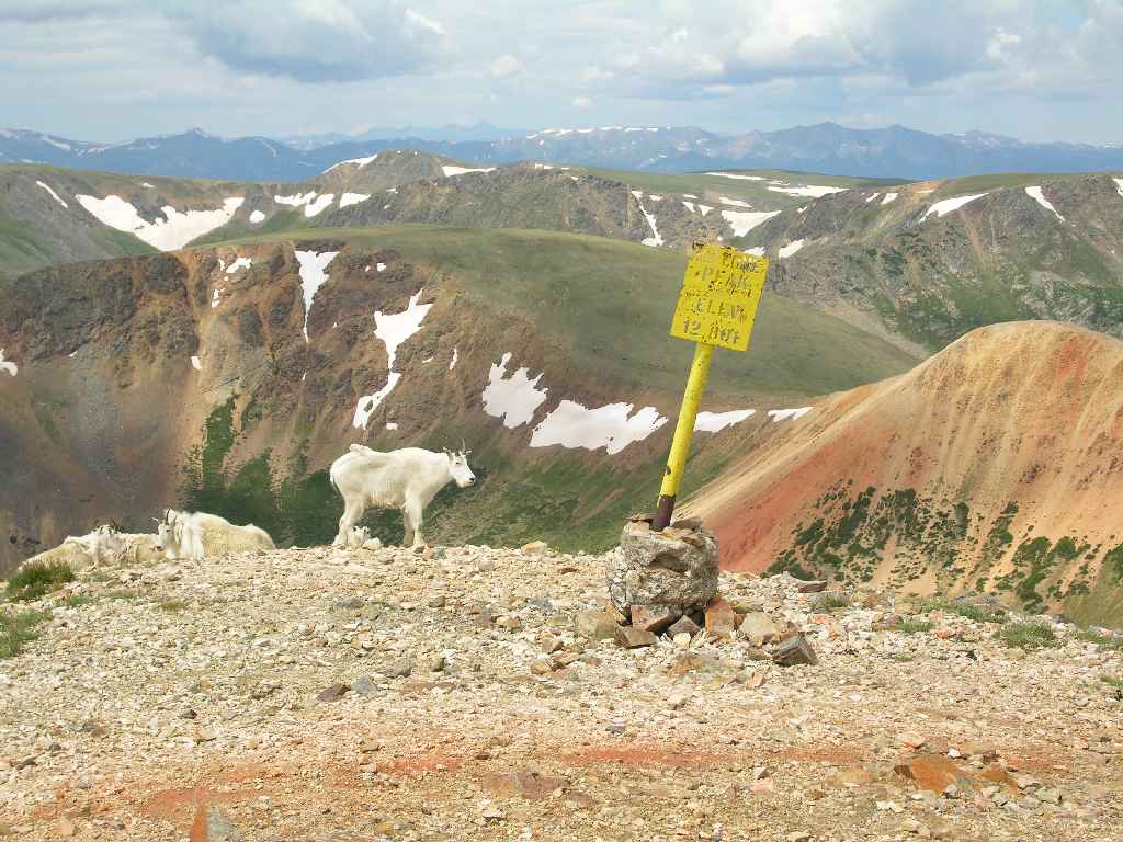 This family of mountain goats was lounging right at the peak (note the yellow sign post, 12,800ft!), ignoring us with that cool stand-offish goat sorta attitude.