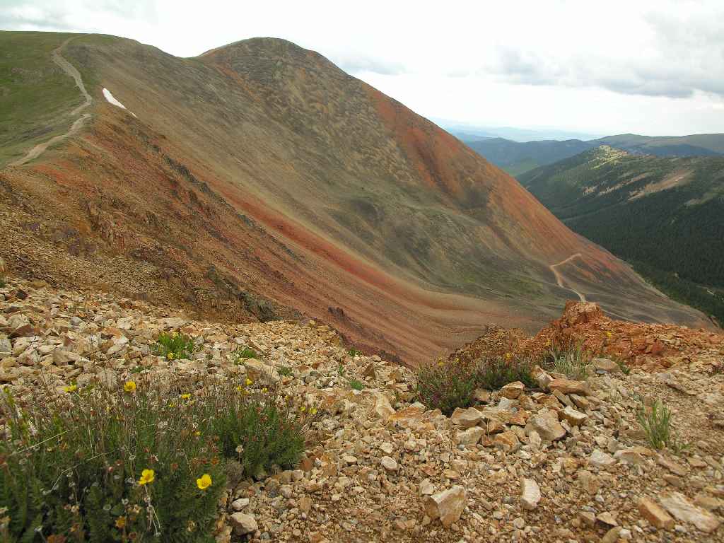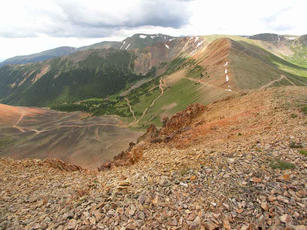 On the approach to the nasty descent sections on the trail off Red Cone, Webster Pass comes into view. Note the snow on the road close to the peak of the ridge on the right side of the pic. We took Georgia Pass (the long way) to avoid Webster Pass, as last week when Greg checked, that snow bank was still blocking the road still.