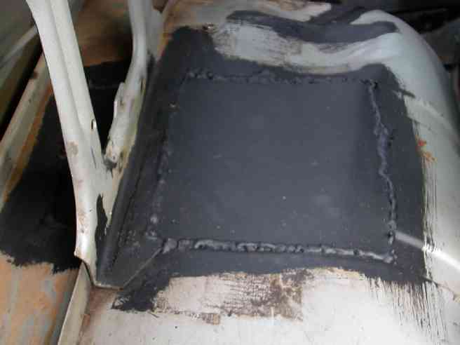 The upper rear wheel wells were both rusted out in a fairly large area. So after cutting out the bad stuff, I welded in fresh metal, and used "rustoleum" to protect the new metal