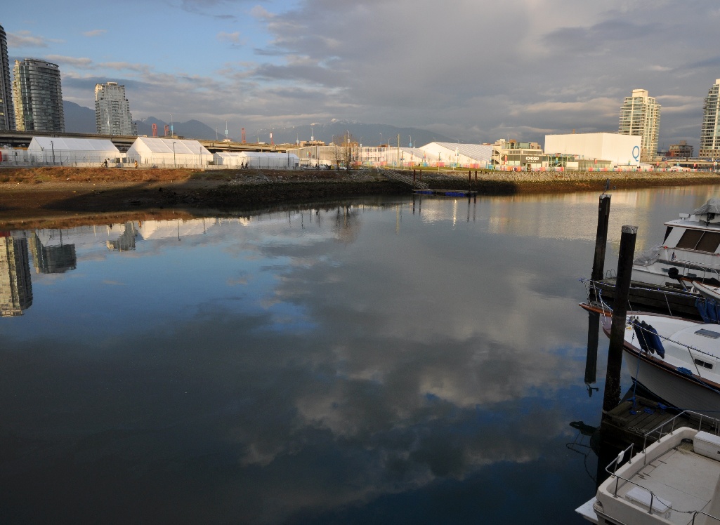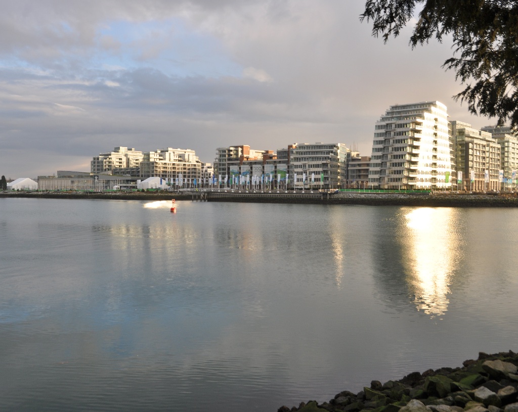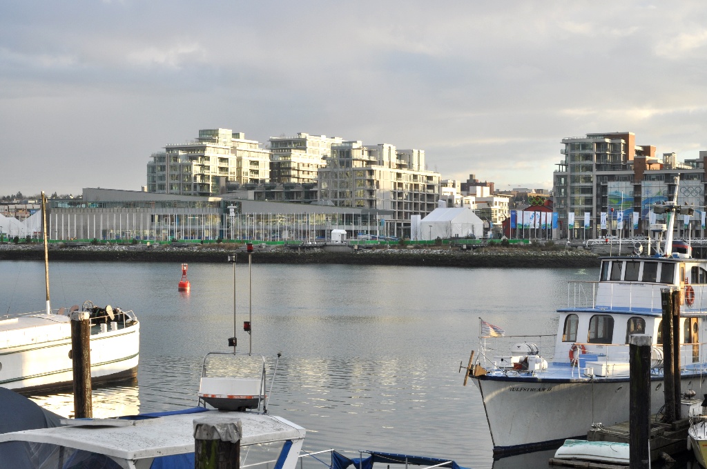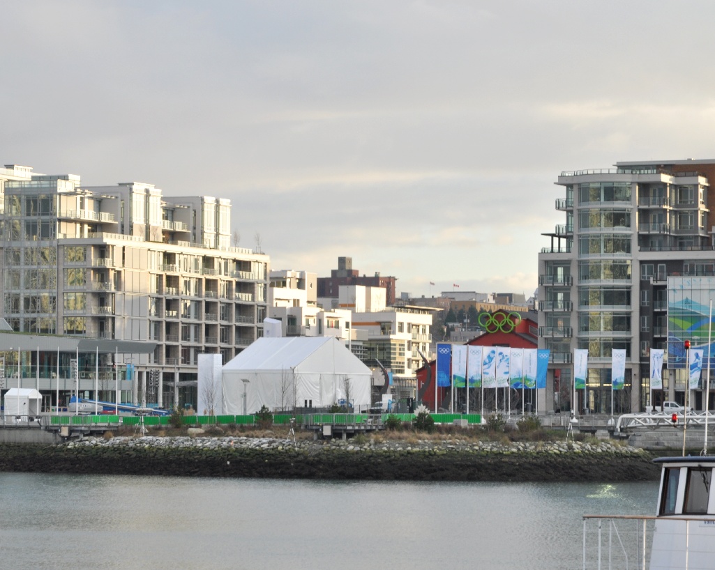 The brown brick building with the Olympic rings on it is the Athletes "Living Room", or common room, and the unoccupied flag poles on the left foreground will fly the visiting country's flag once they officially arrive.