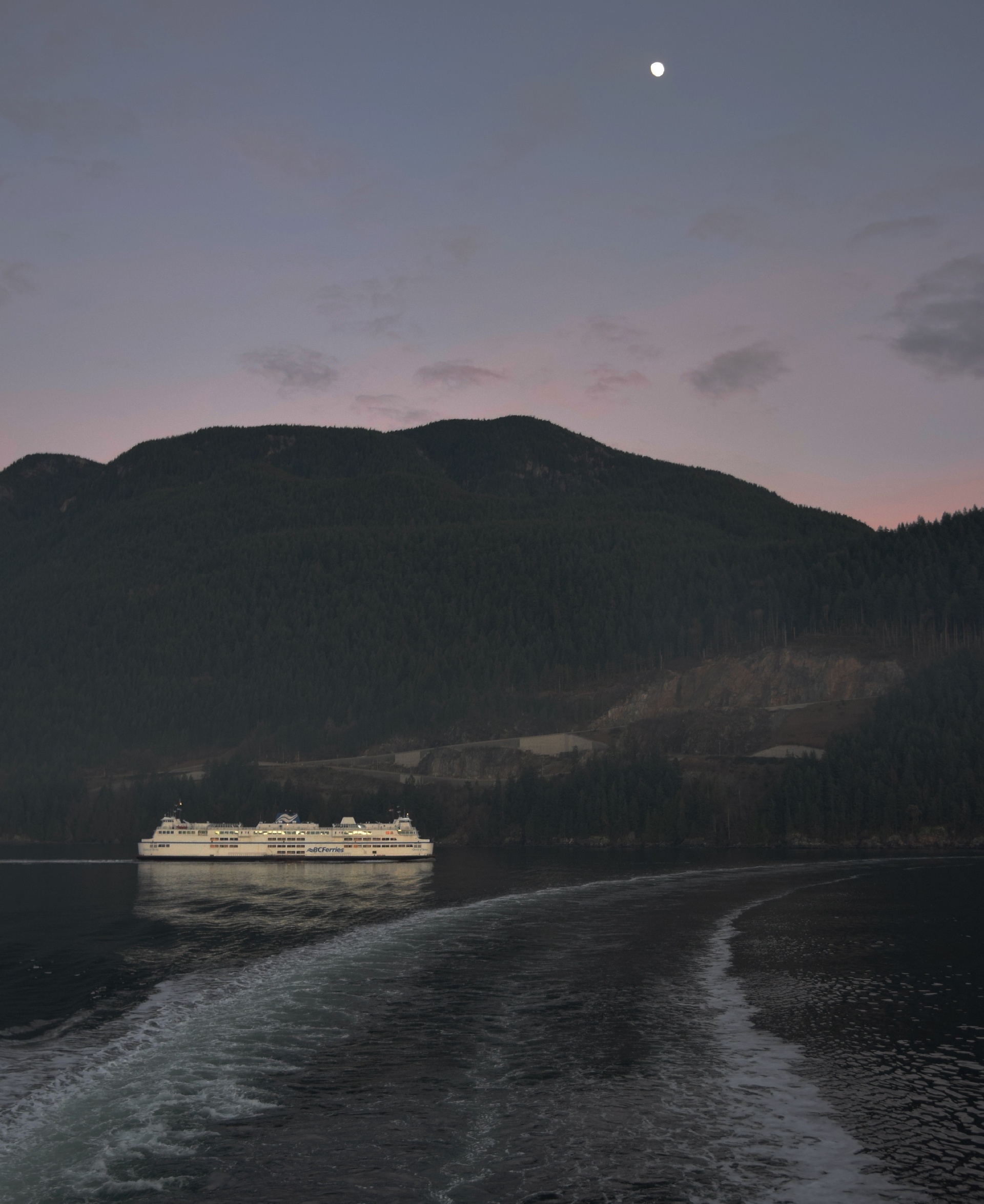 The late afternoon ferry to Vancouver Island, under the light of the moon.
