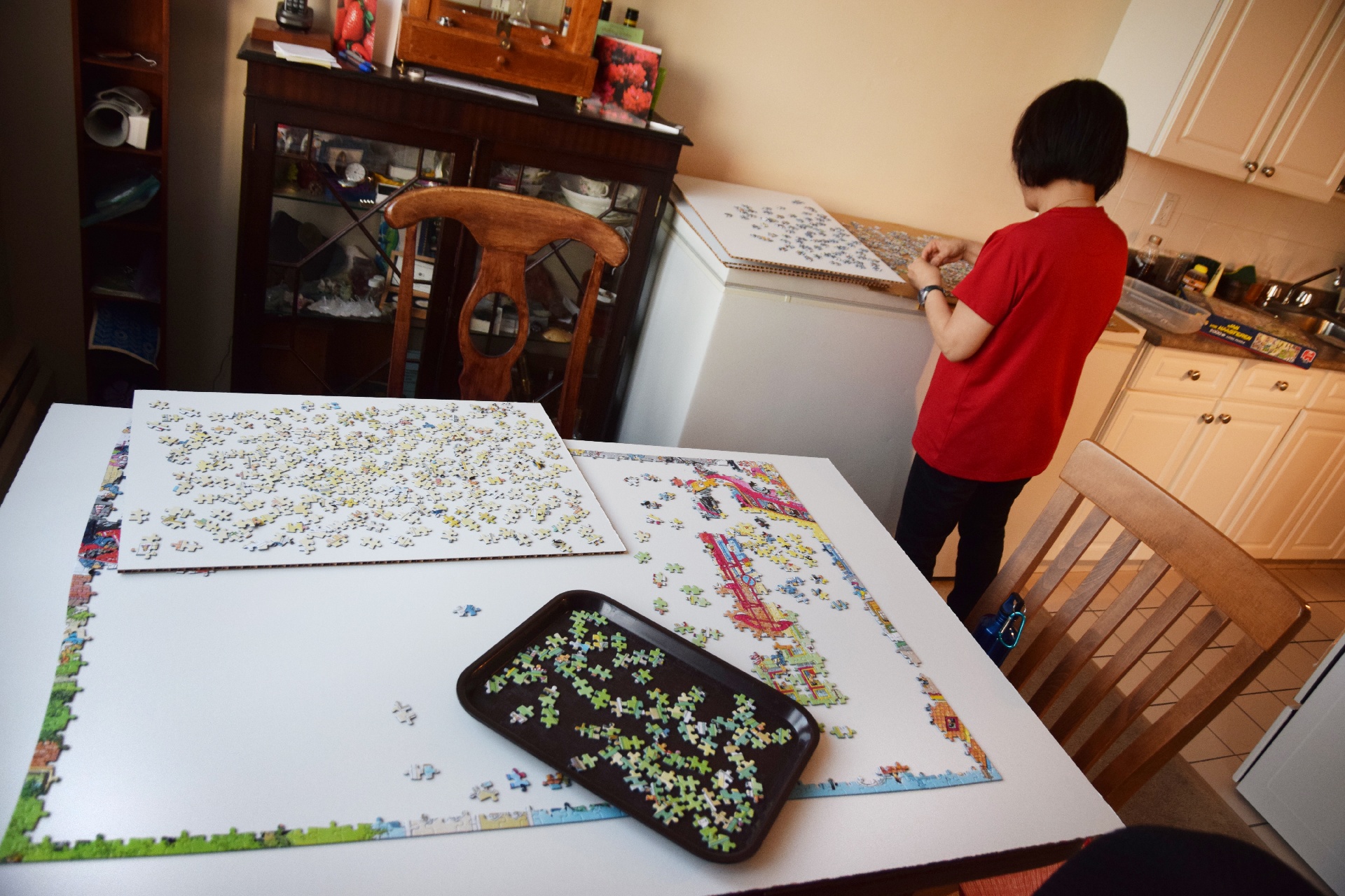 Unassisted. Can she do it? It's a 2000 piece puzzle, and her previous record is only 1500. Day 1. That tablecloth might not be a good idea...