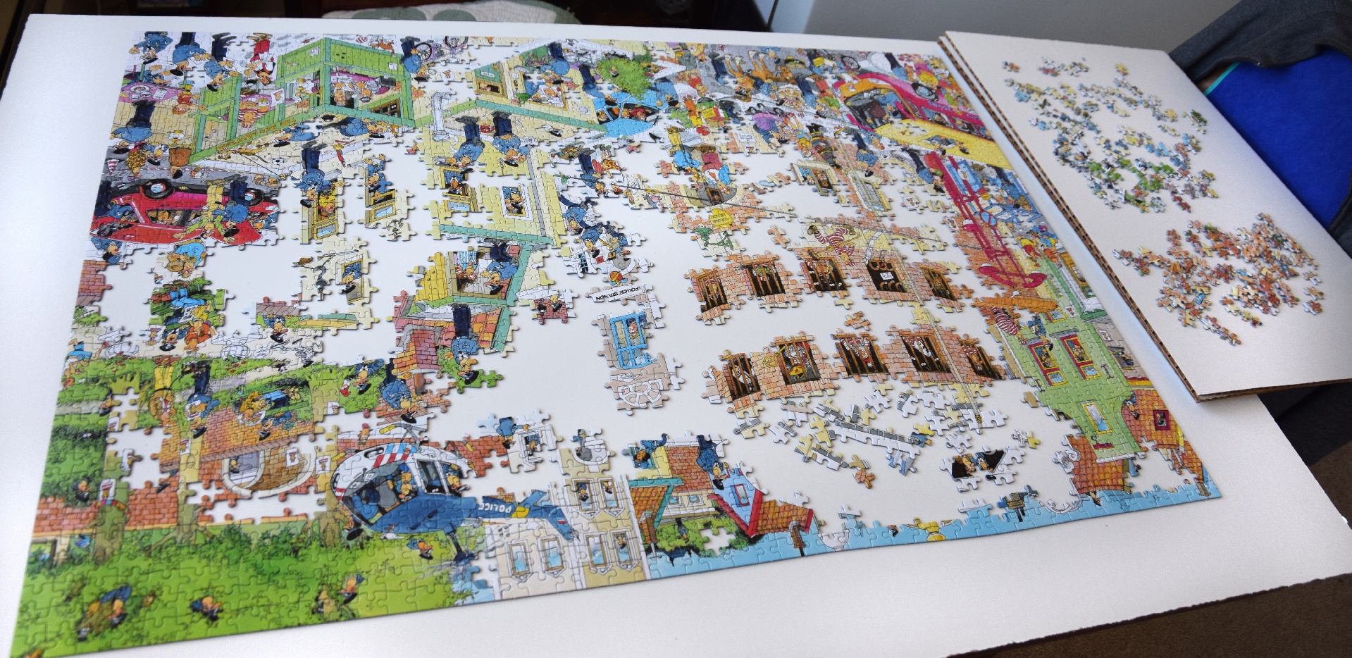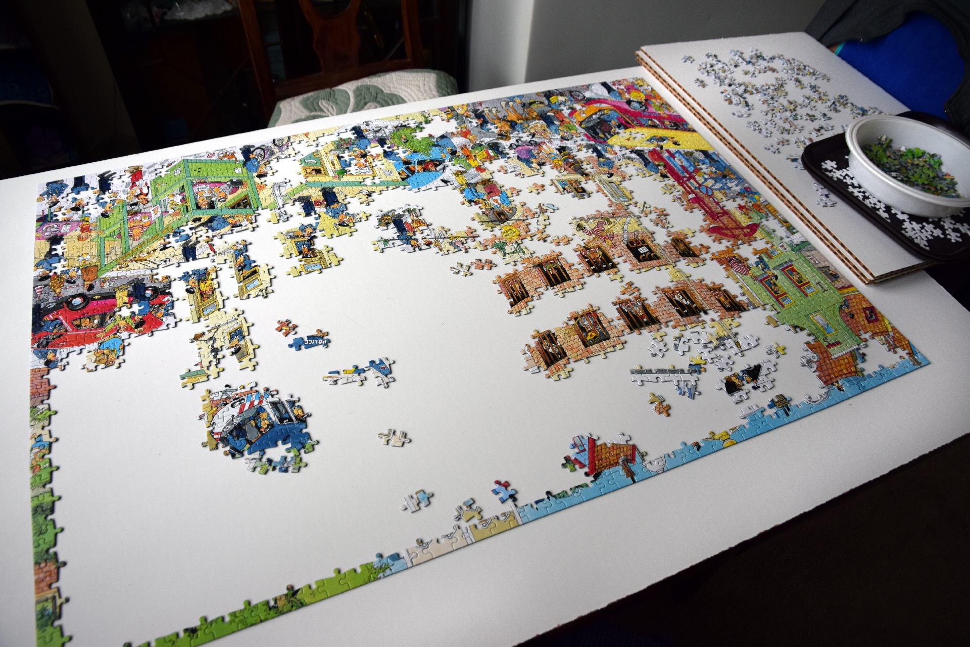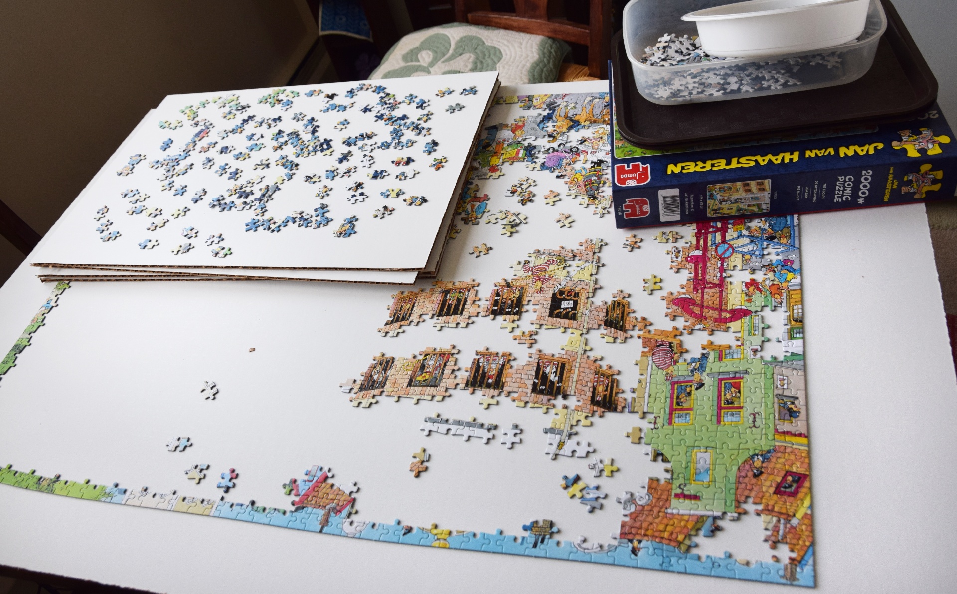 Day 2. The need for a proper puzzle-building surface prompted the addition of this very sturdy honeycomb-core cardboard.