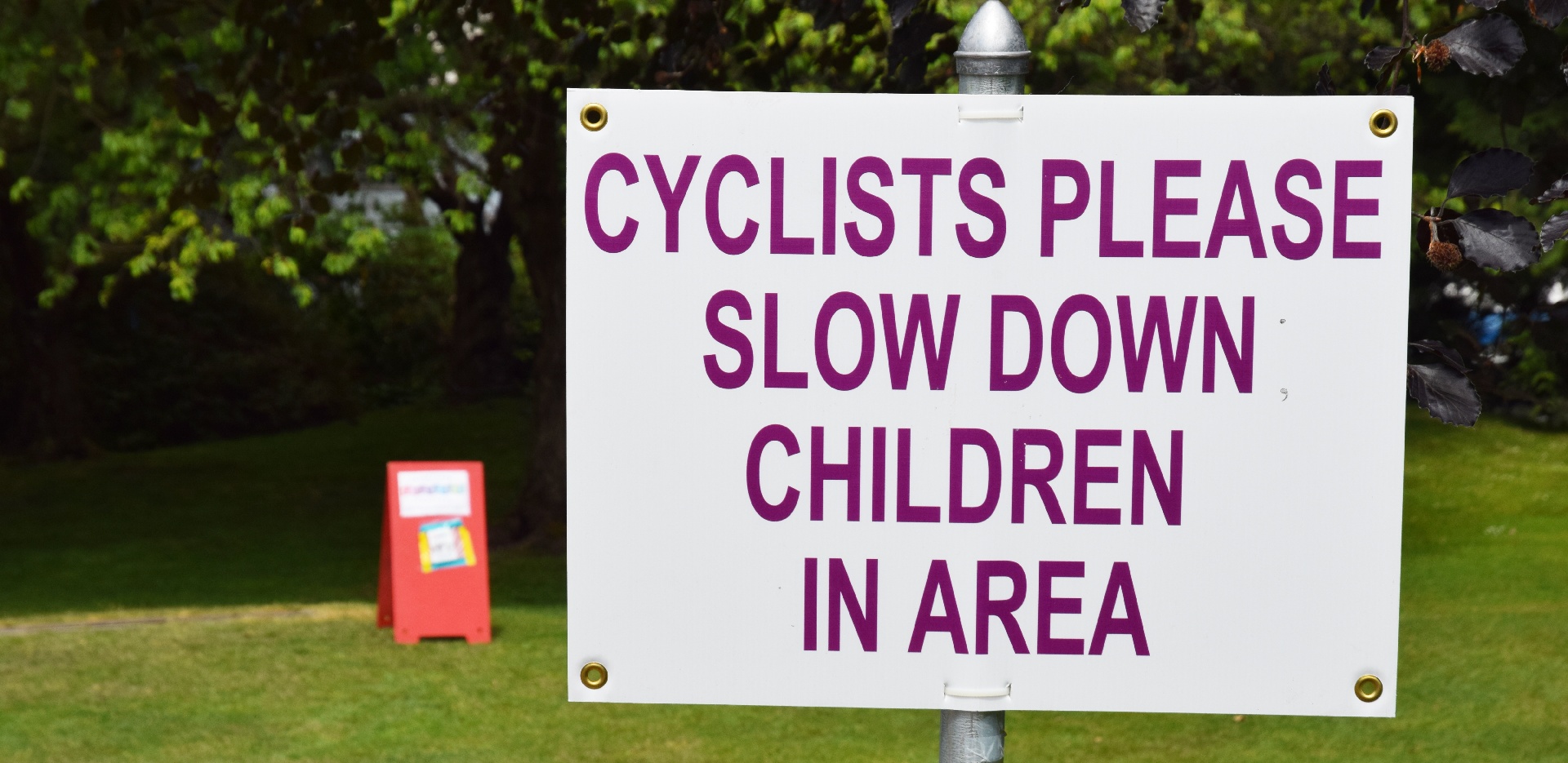 I talked with the person putting up this sign, and said: "That sign is telling the cyclists to slow down the children." I like to be helpful...
