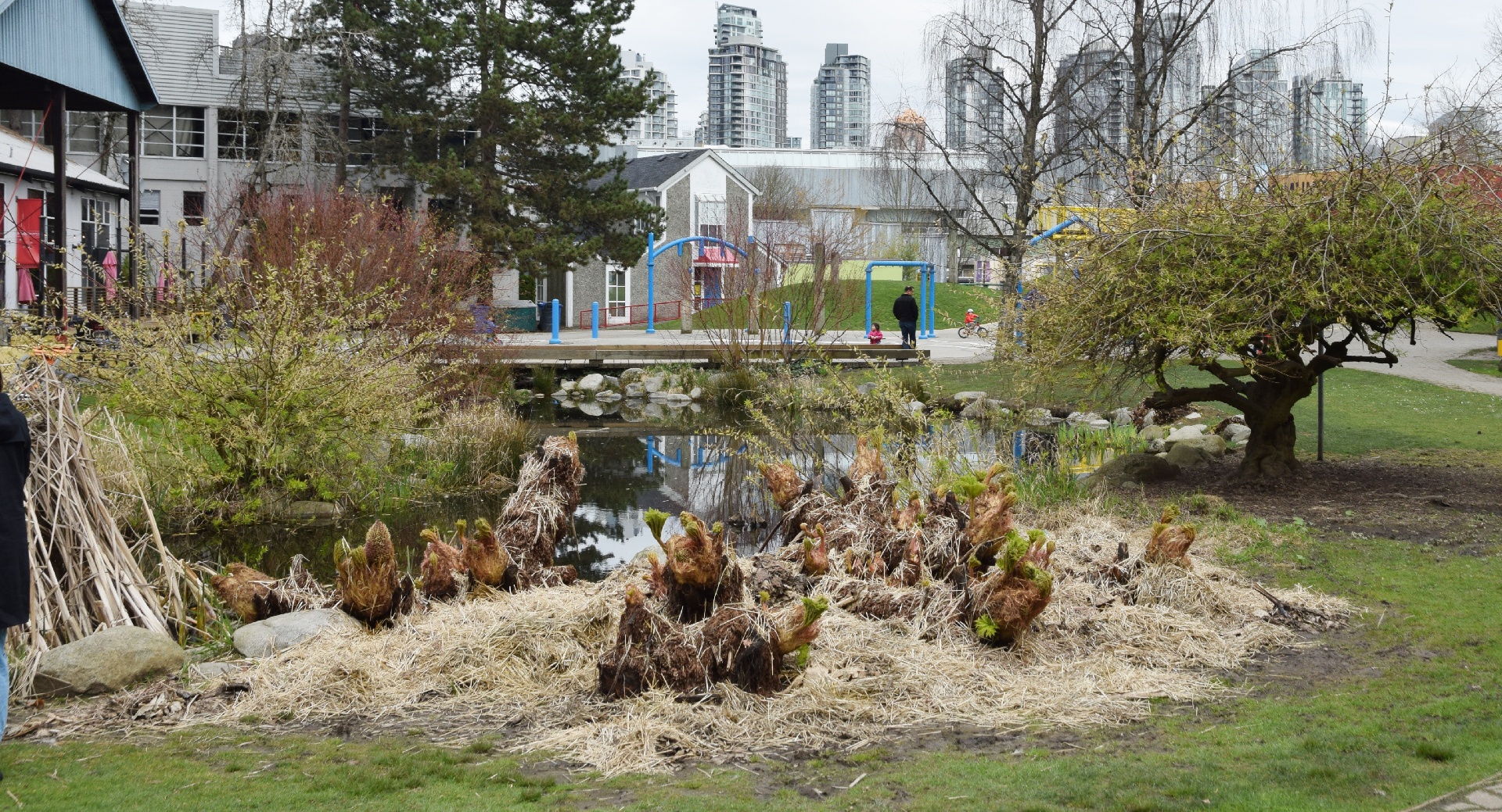 Granville Island, and the geese herders... 26 young geese, and more out of the picture in front. The kids were herding them along, and the adult goose was just following along.