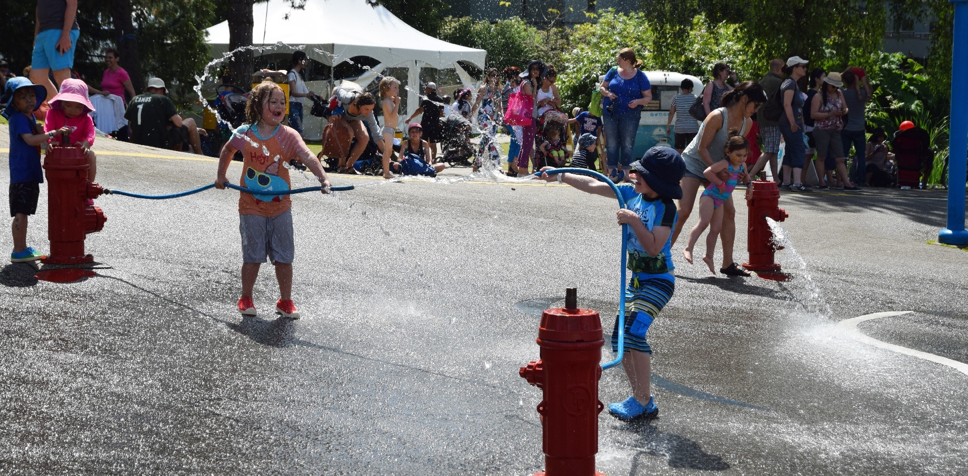 They are all running from the post that the boy in blue is leaning on. It suddenly came to life, and sprayed them all!