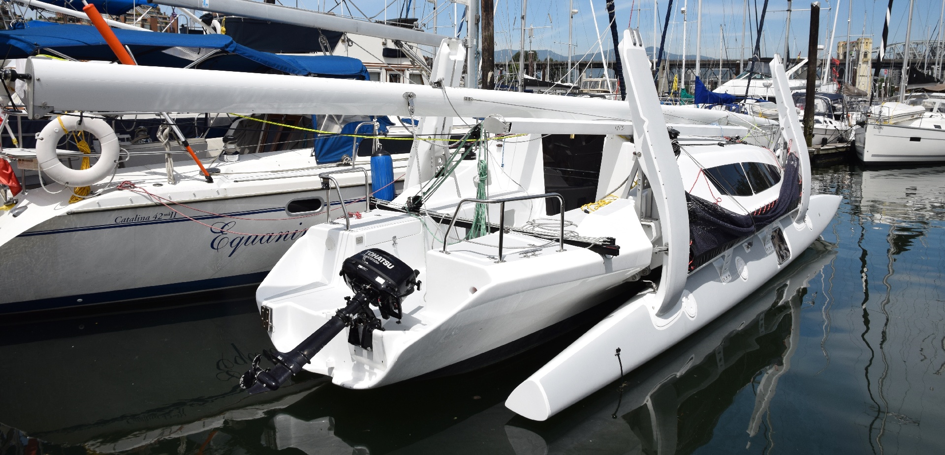 This trimaran folds up nicely, allowing it to use a normal width monohull berth. Cool toy...
