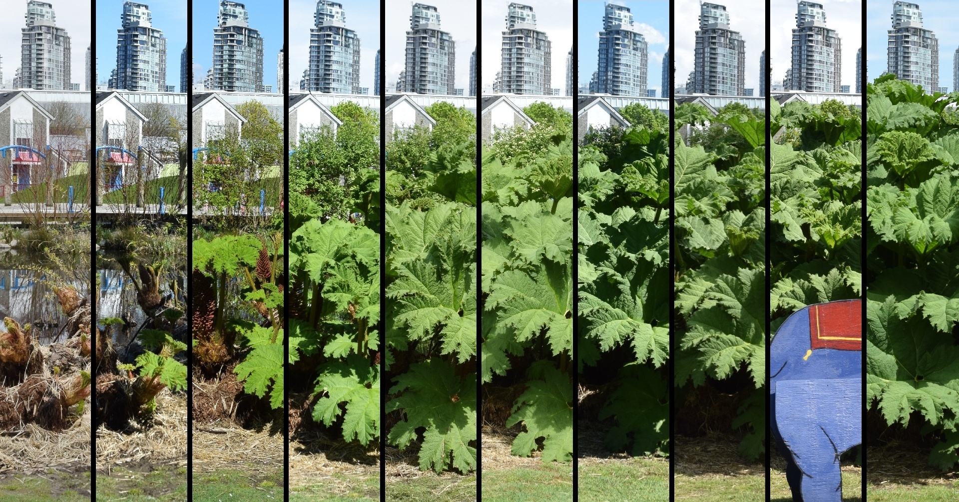 Each slice of the picture is 7 - 10 days later... The purple thing is from a plywood hippo, a part of the Children's Festival signage.