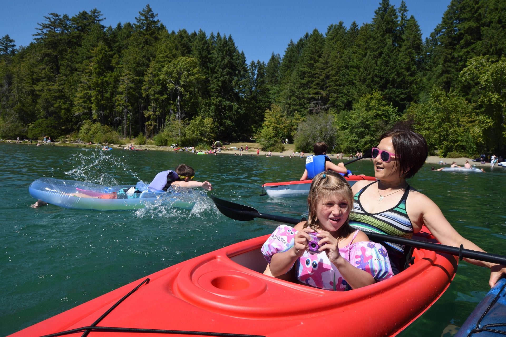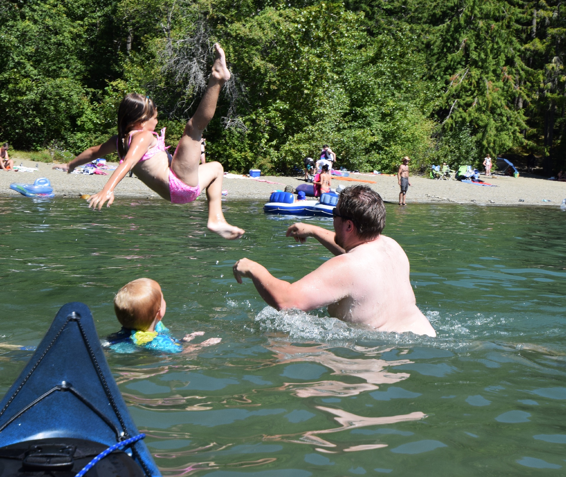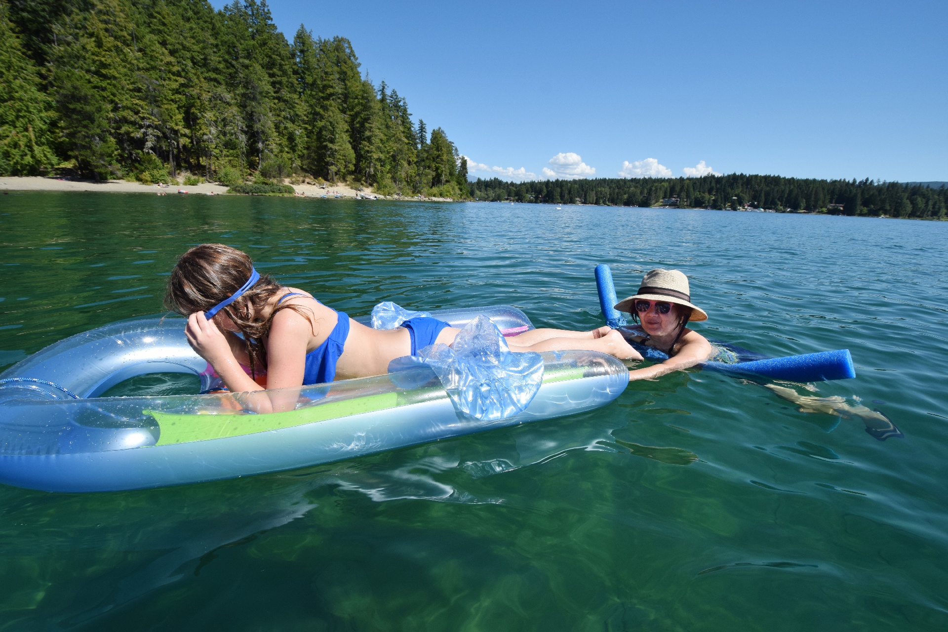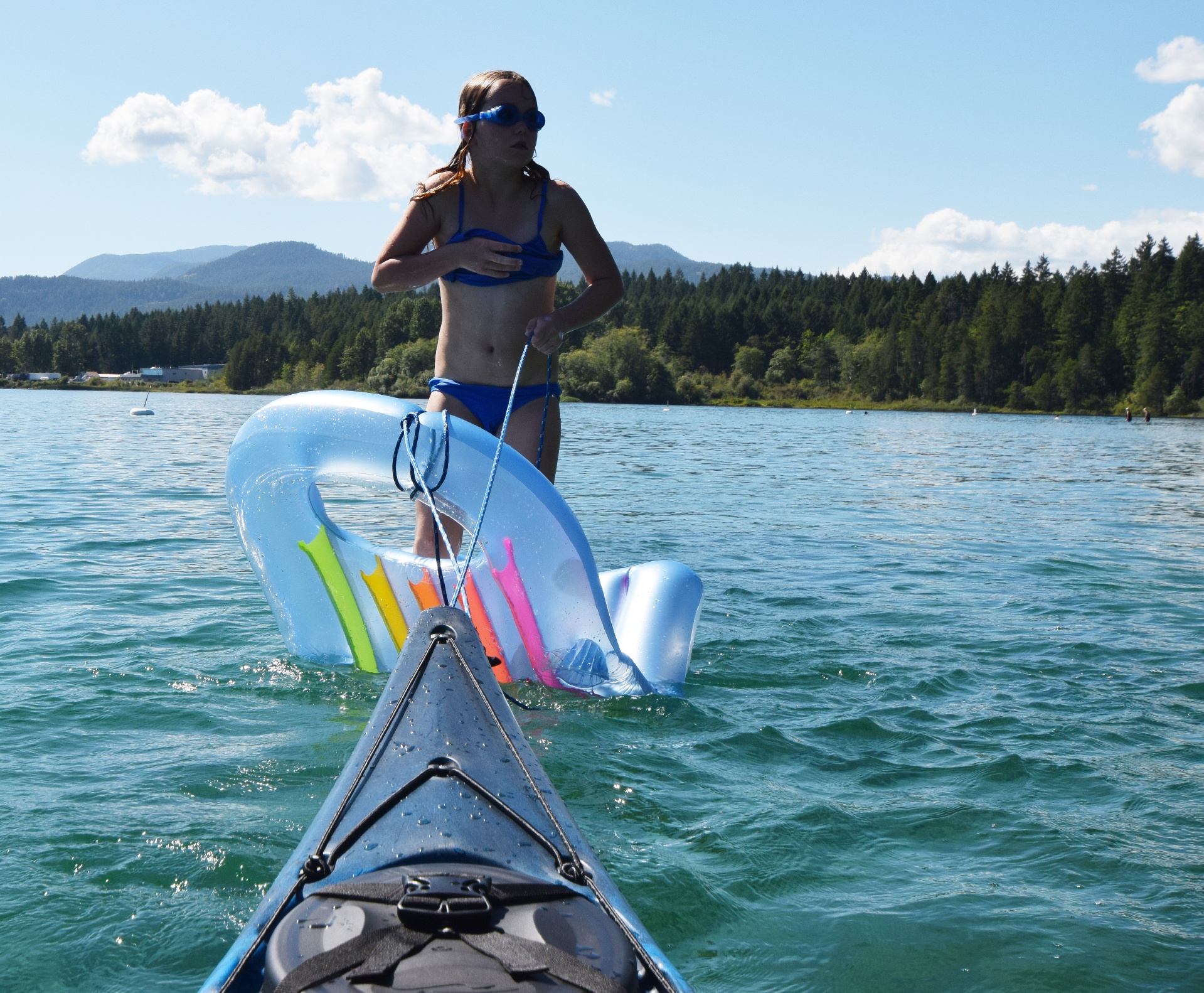 So. Let's see: I'm paddling backwards using both hands, while taking pictures using both hands, so that she can "waterski" on that floating toy. Successfully. ...finally...