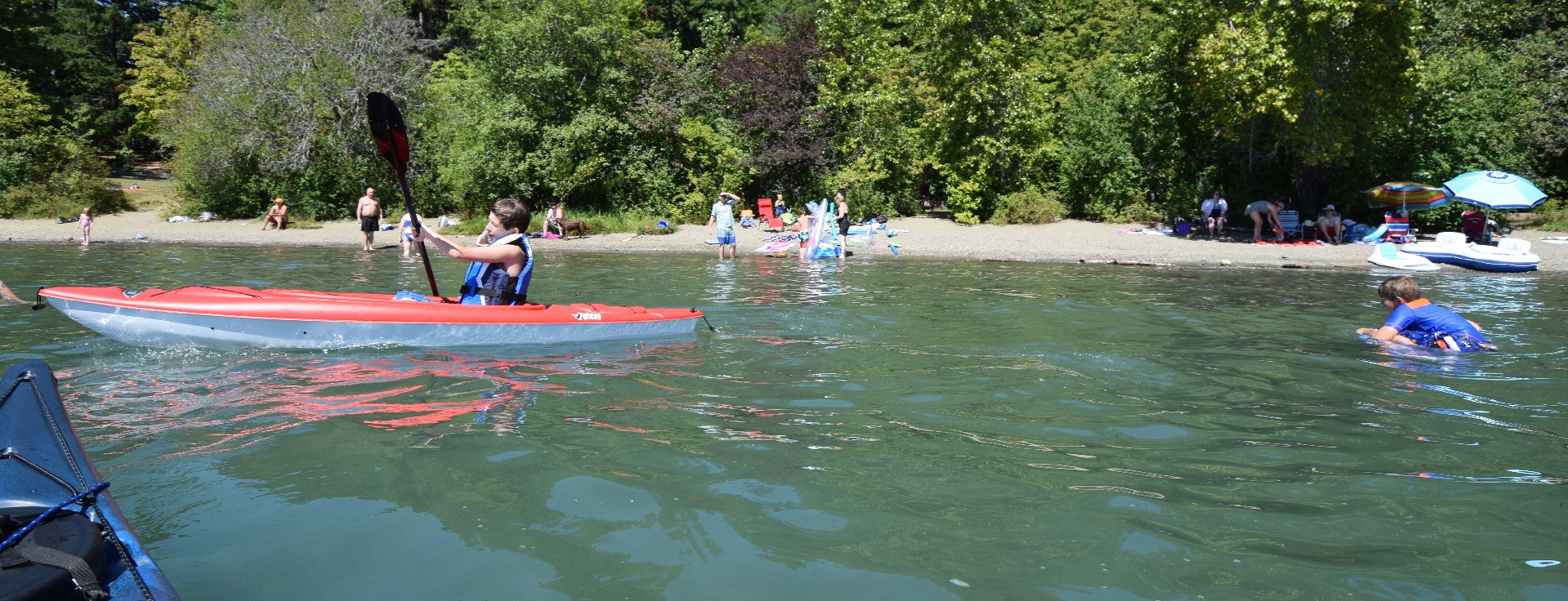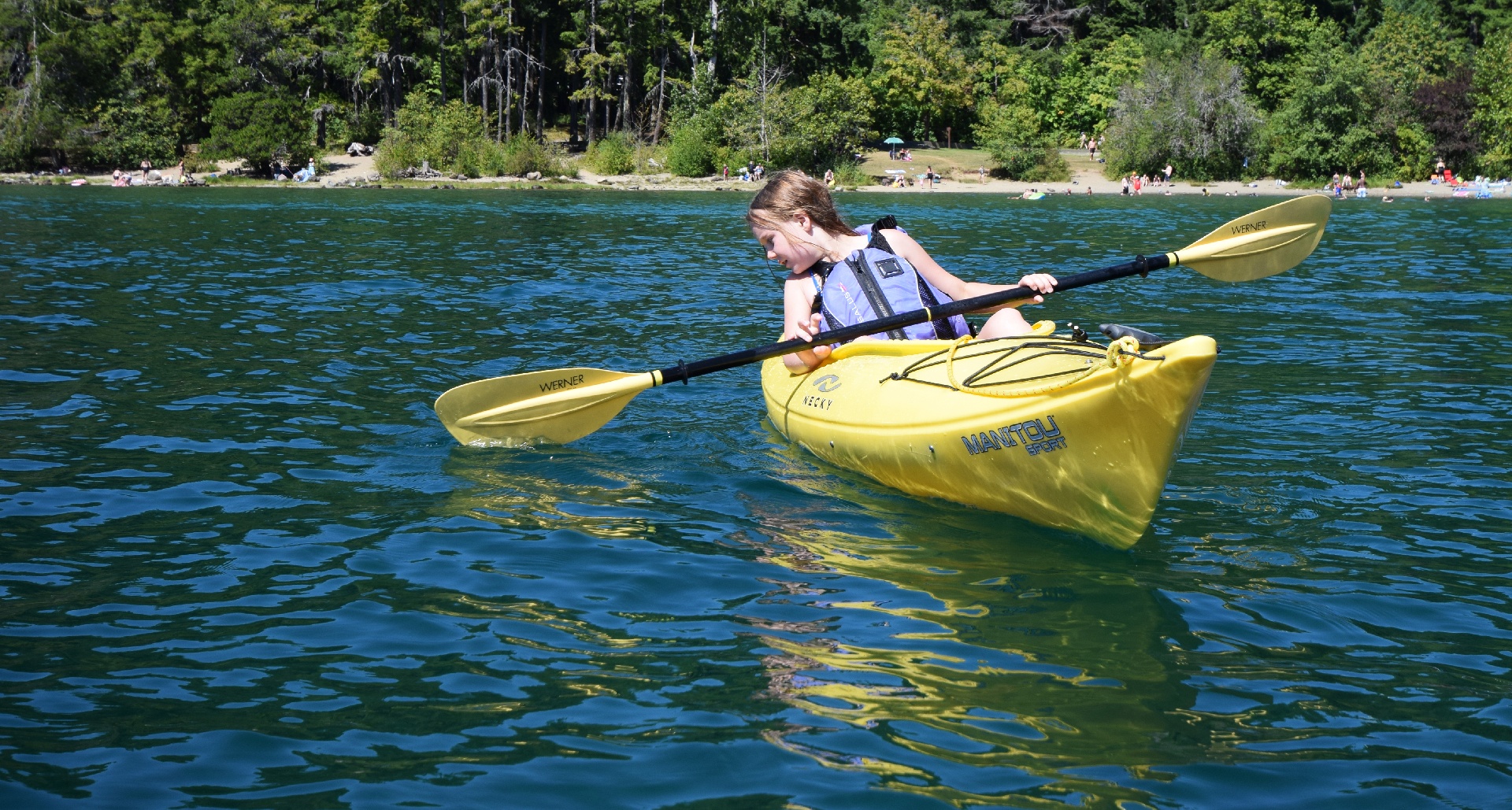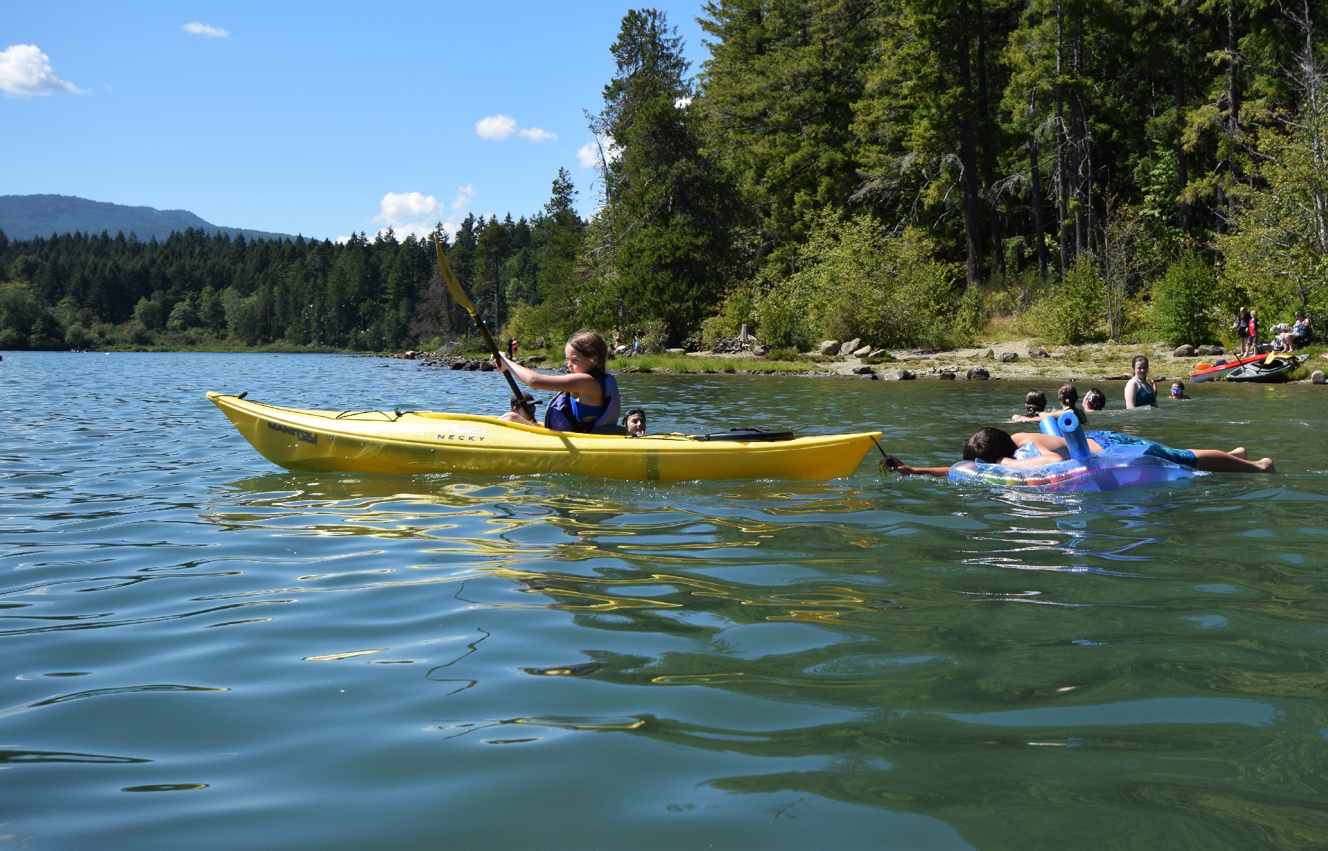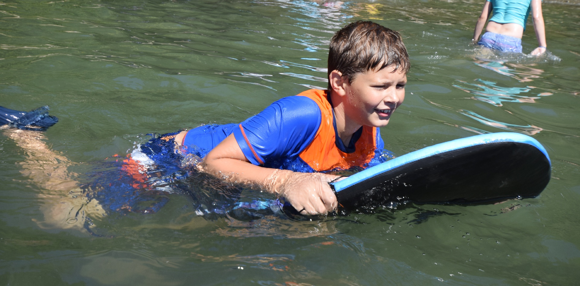 So. Let's see: I'm paddling backwards using both hands, while taking pictures using both hands, so that she can "waterski" on that floating toy. Successfully. ...finally...