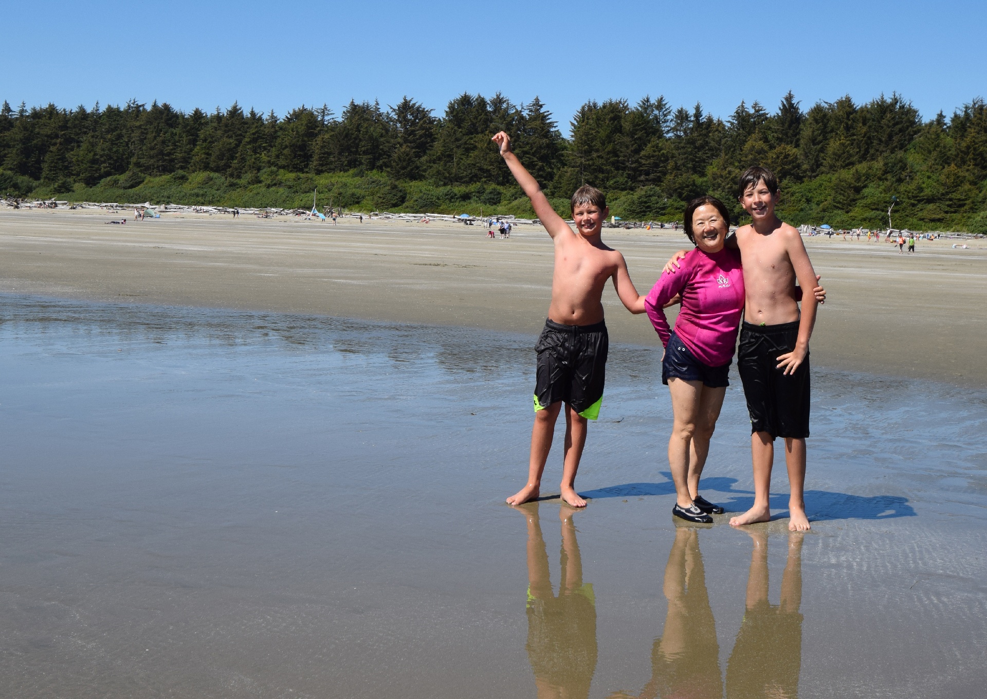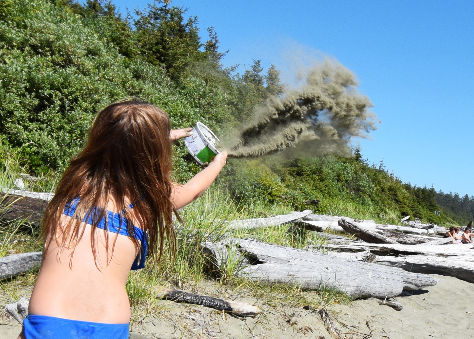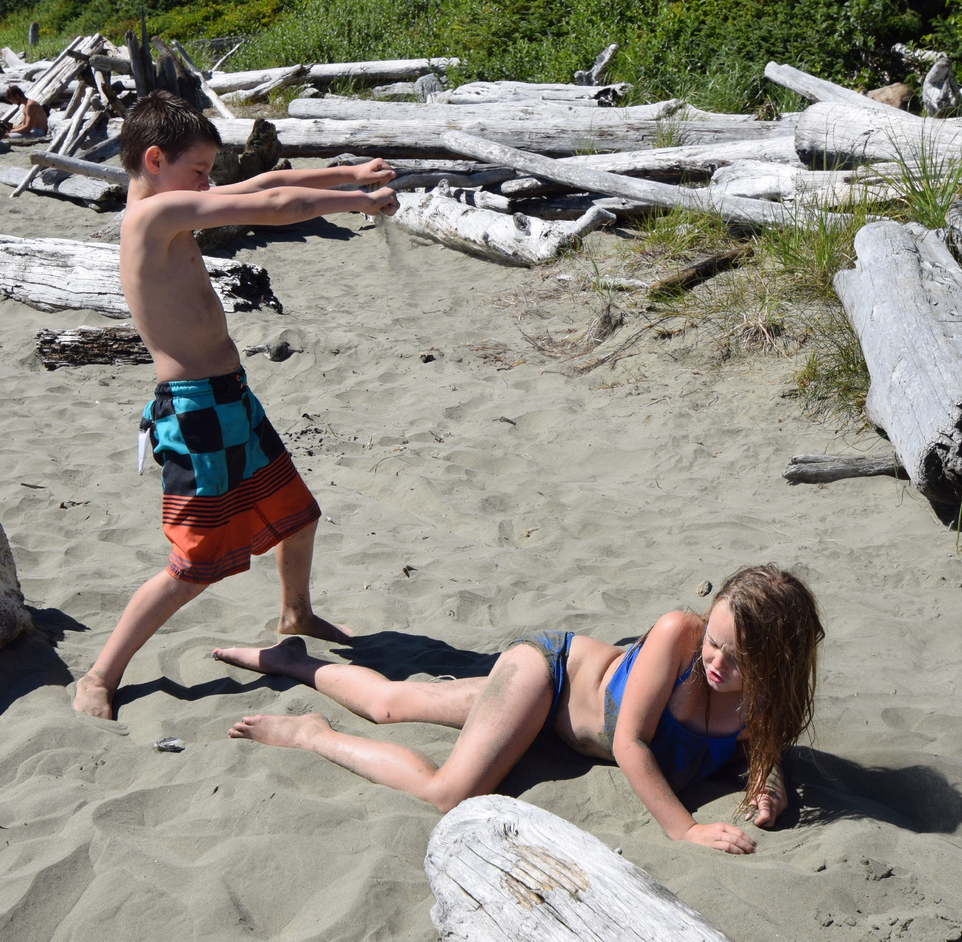 But not quickly enough, so the boys began their battle! Taryn wisely declined the invitation. Besides she was preparing to cook dinner: sand, crab shells, and sticks...