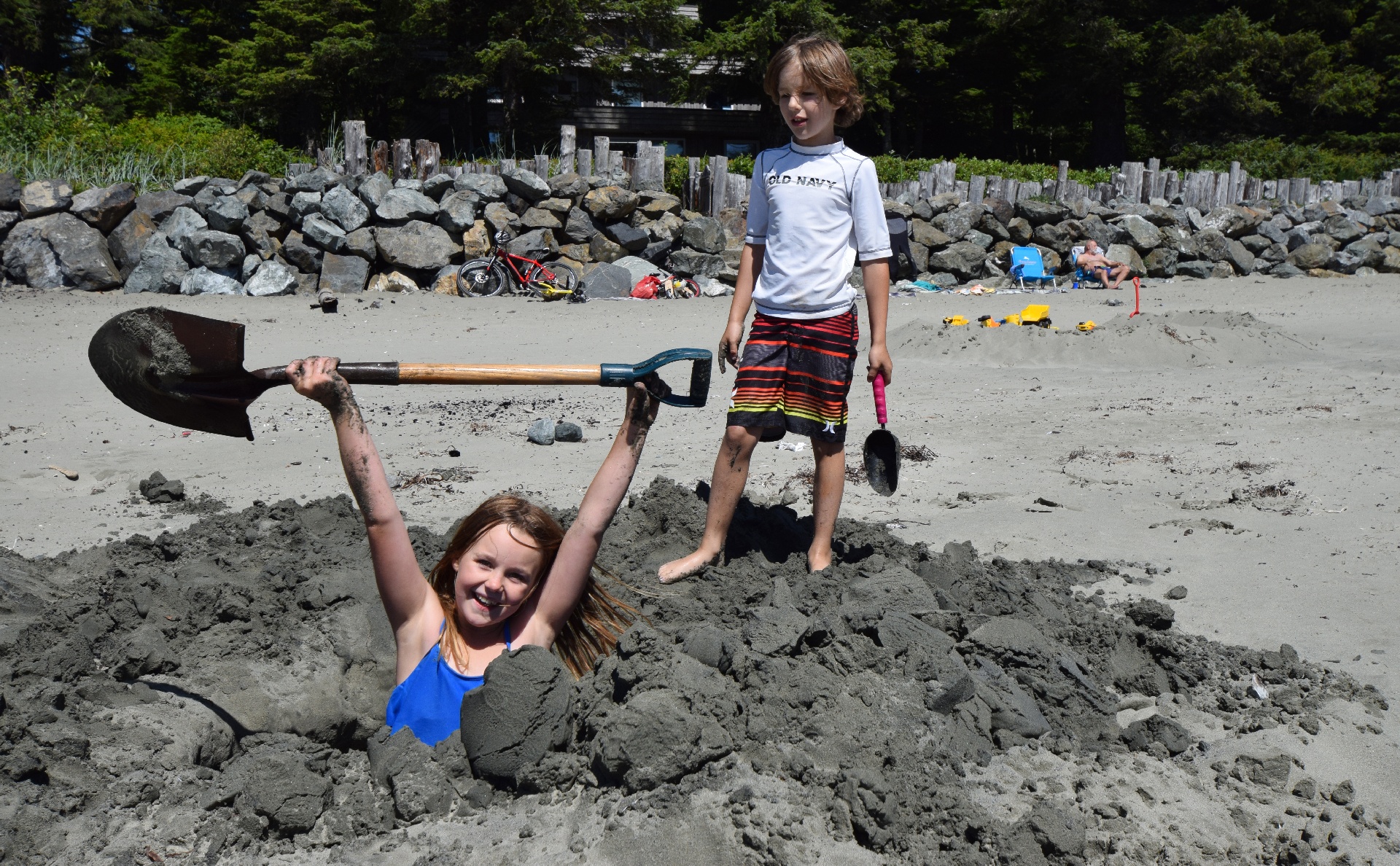 "I found your shovel!" The truck shovel and the metal gardening trowels were popular. Rob and Alaina made good use of them, and attracted a few of the nearby kids...