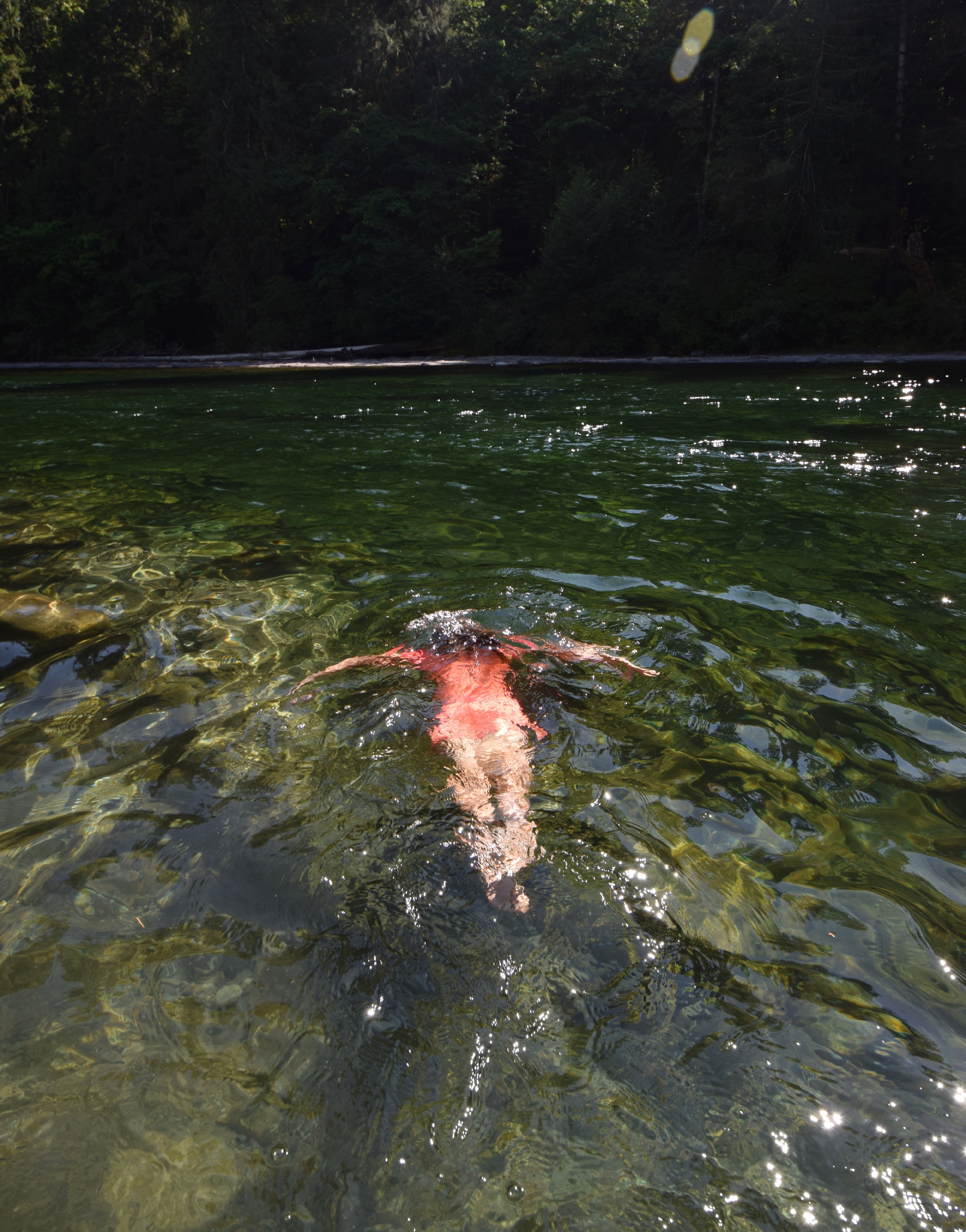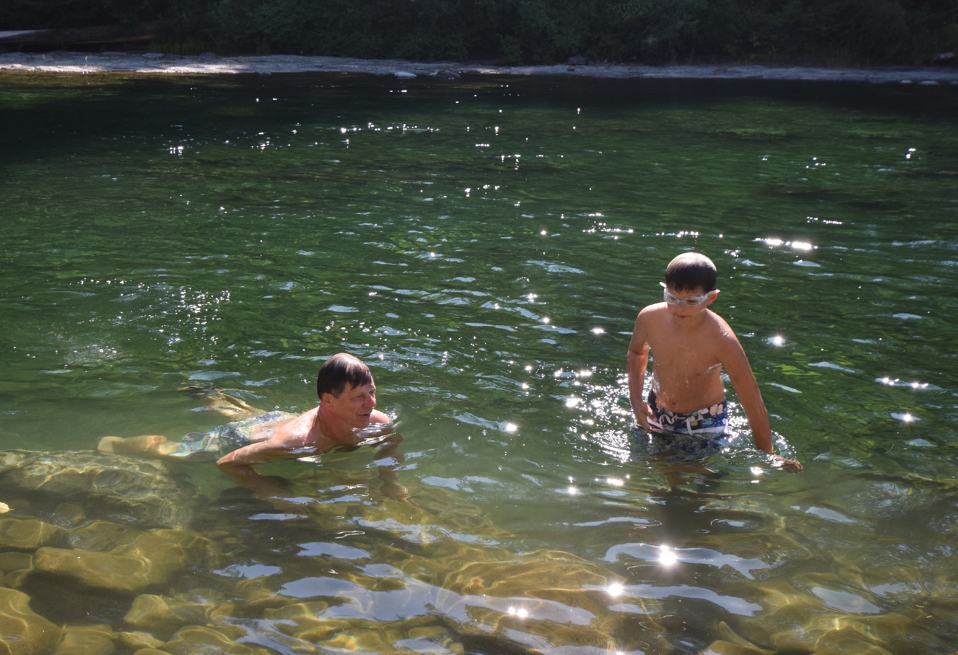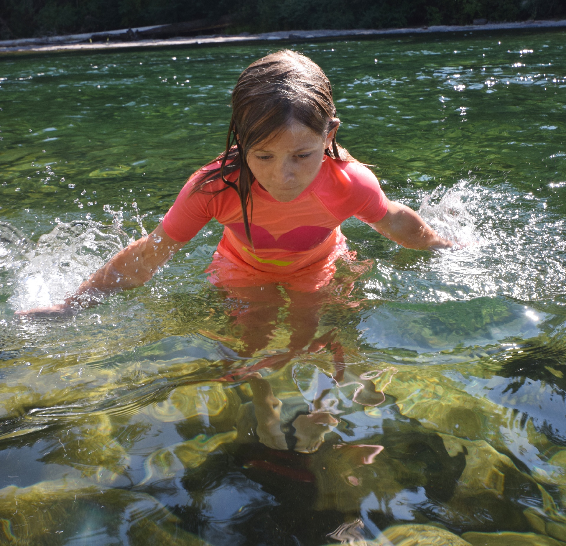 Usually she is wearing some floatation devices, but not this year. "I'm going to swim all the way over to there!"