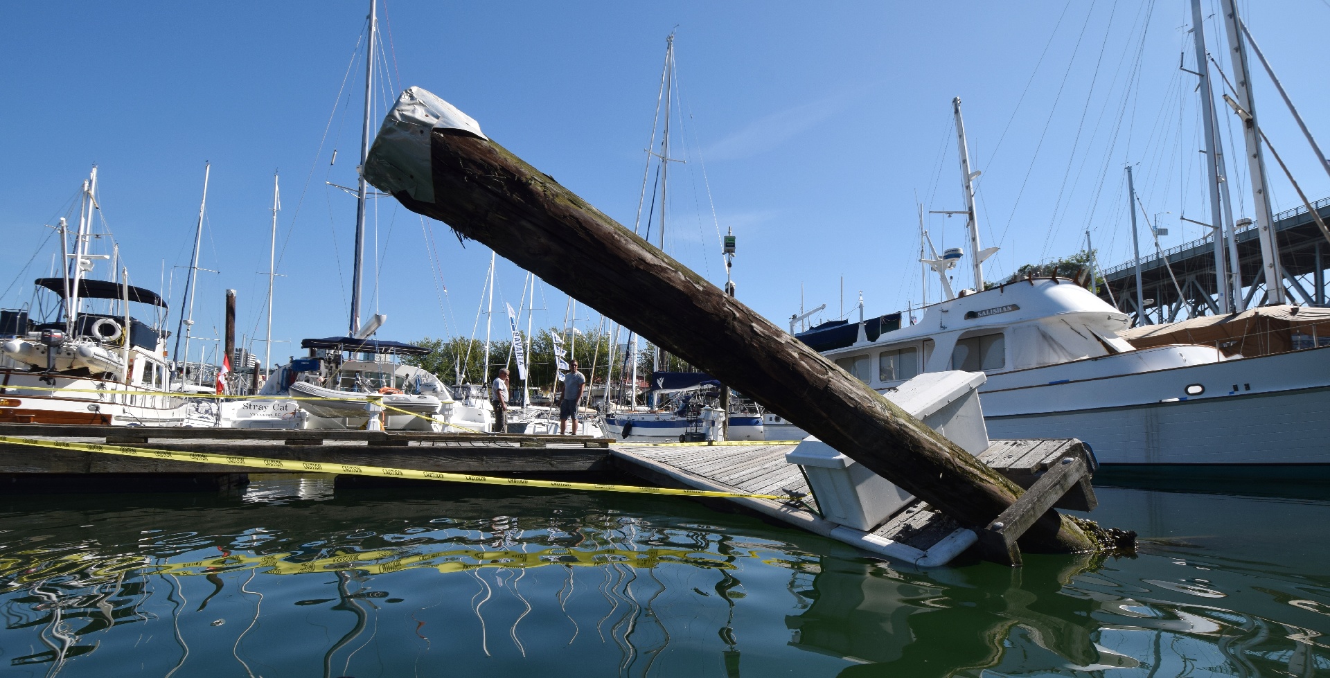 Apparently it rotted clean through at the bottom, and didn't survive the last bump from one of the bigger boats.