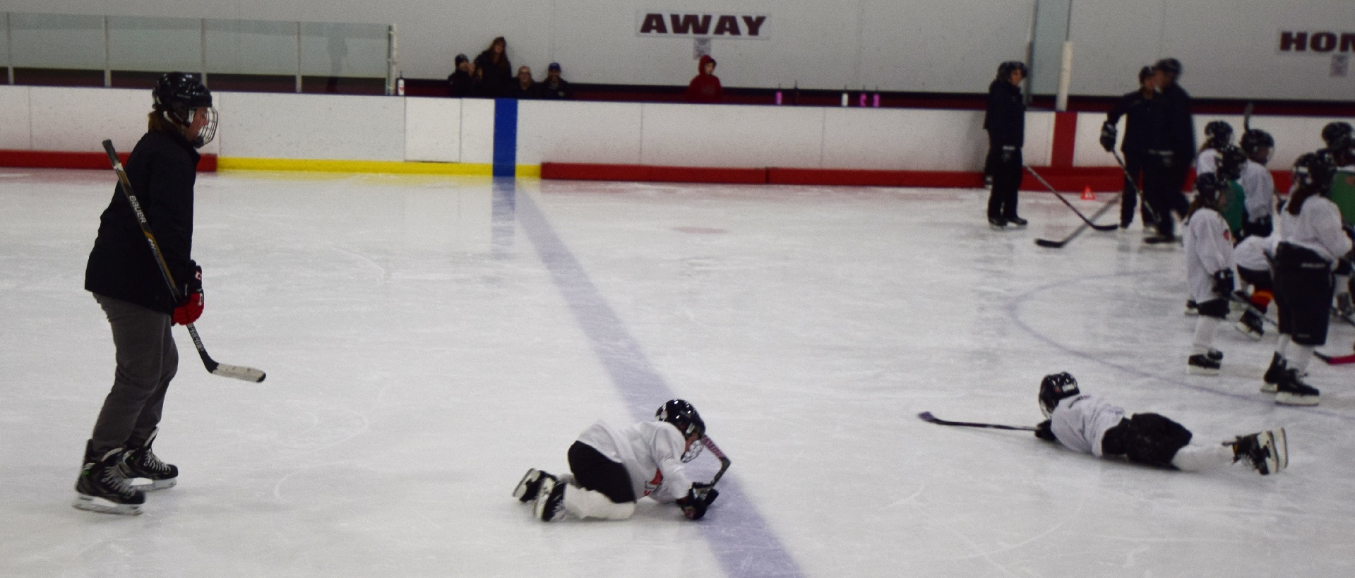 Lucas' second hockey practice! ...he's the one down on his left knee, between the 2 players with stiped socks.