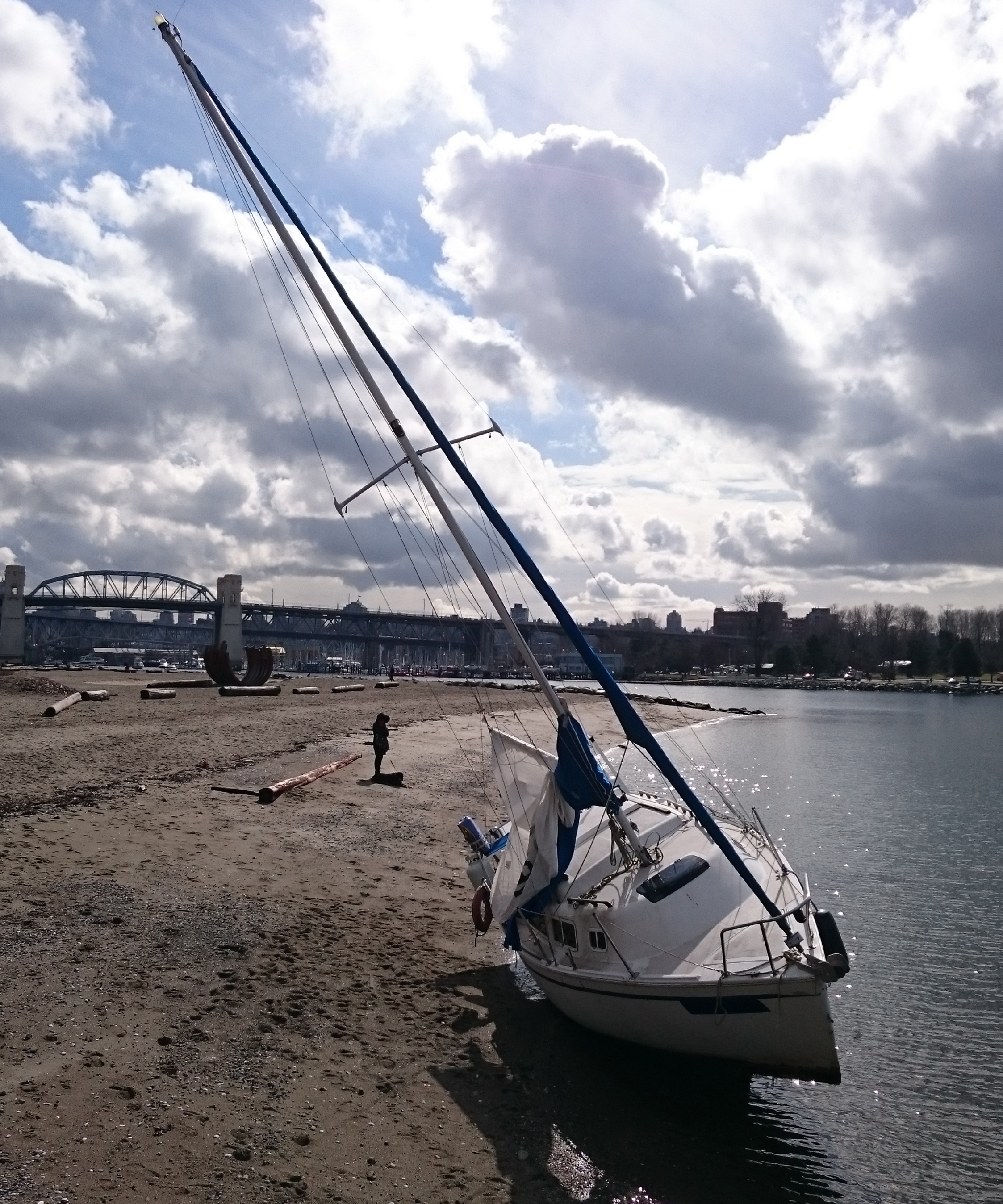 Uh oh. This guy has dragged anchor part way down the channel. It's a powerboat, nose down into a wave, and covered by a tarp.