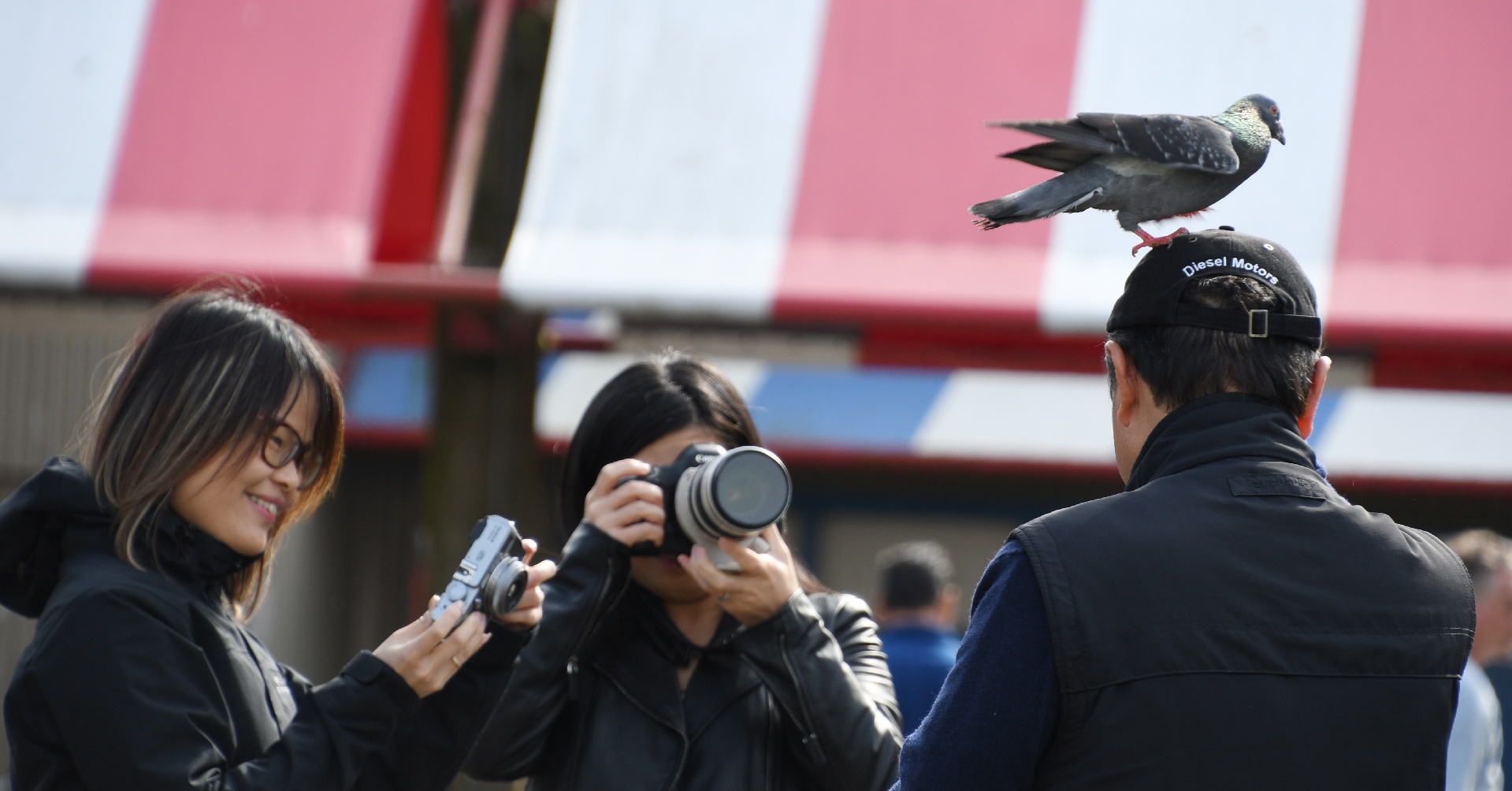 The old guy with nothing better to do is sitting in the park feeding pigeons. And being photographed by another old guy with nothing better to do...