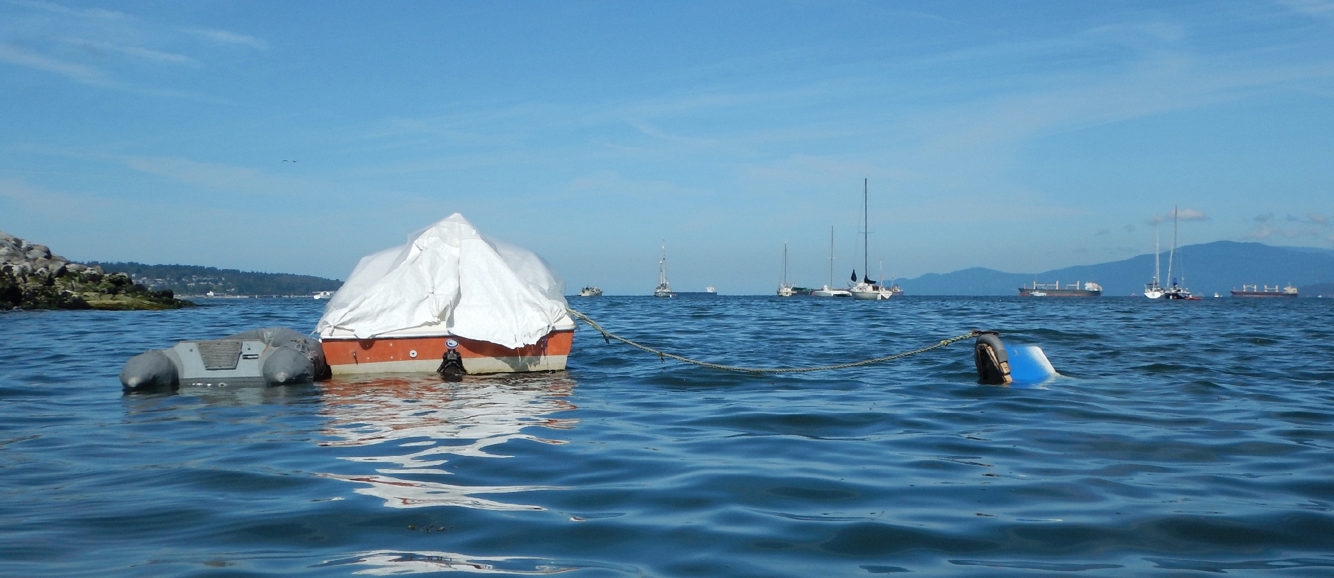 When I paddled by 30 minutes ago, the blue boat was afloat, but sitting low in the water... When paddling on the way back, I saw this. There's a motor on the back...