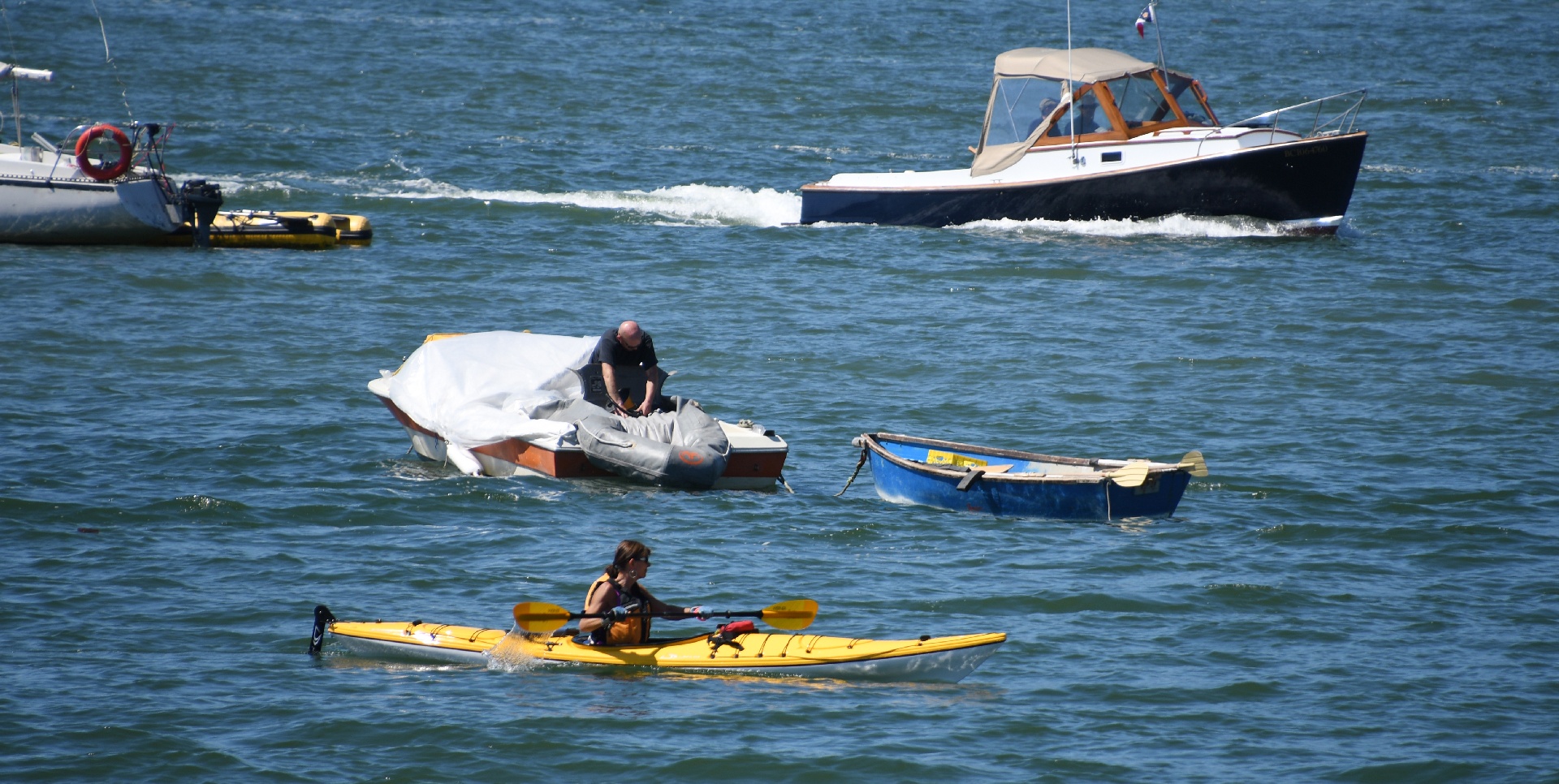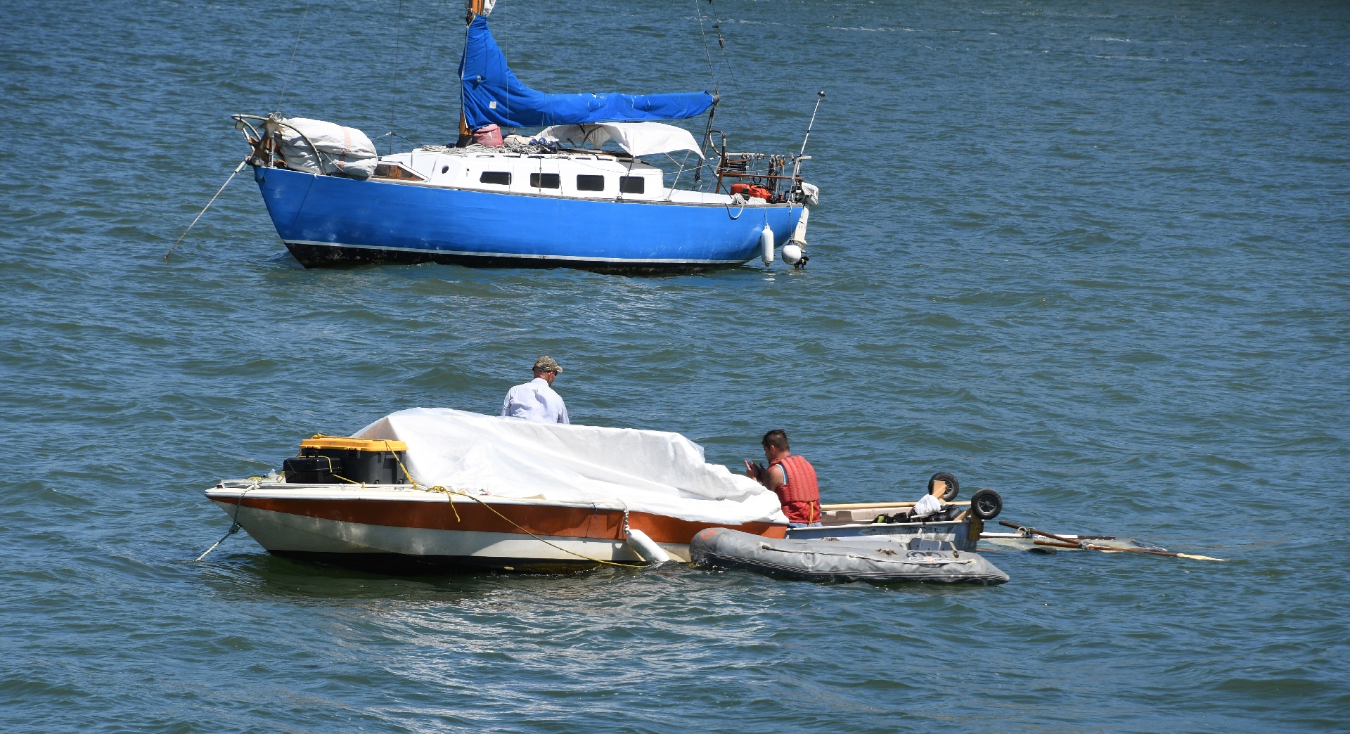 This is a few days later. The blue boat is still afloat, but now has no motor. Here the grey inflatable is being pumped up.