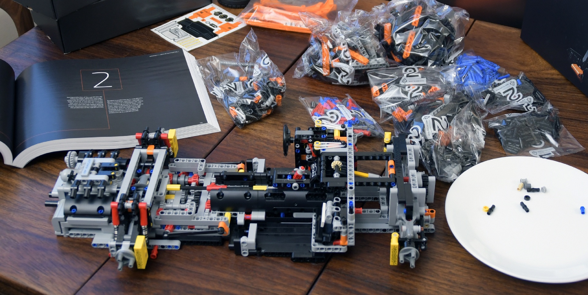 Inside the heavy main box: 4 smaller boxes, and a very thick instruction manual! First box begins. Engine, drive train and sub-frame.