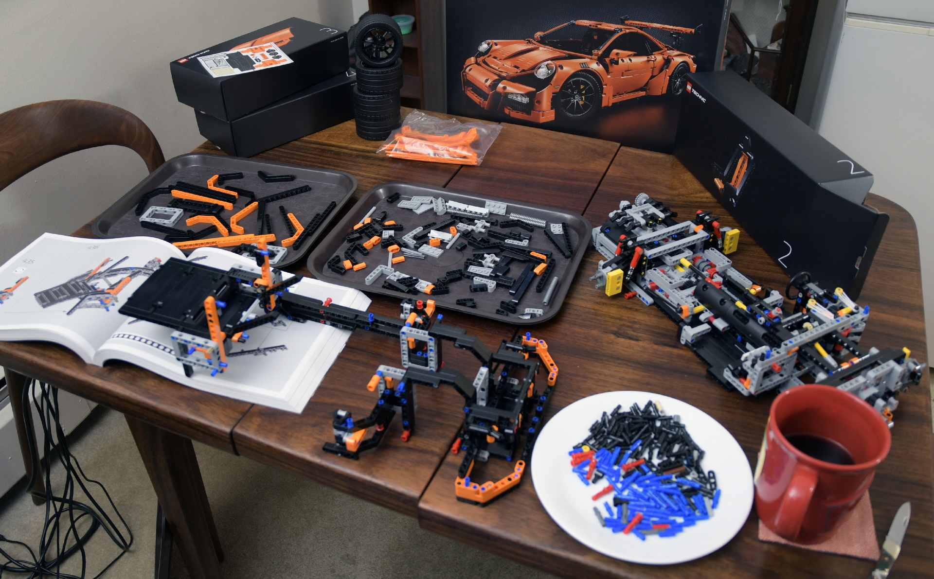 And another 56 minutes later, the 3rd box is done! Now the back is mostly completed... Hmmm. A Ferrari mug, beside a Porsche model. Tacky!