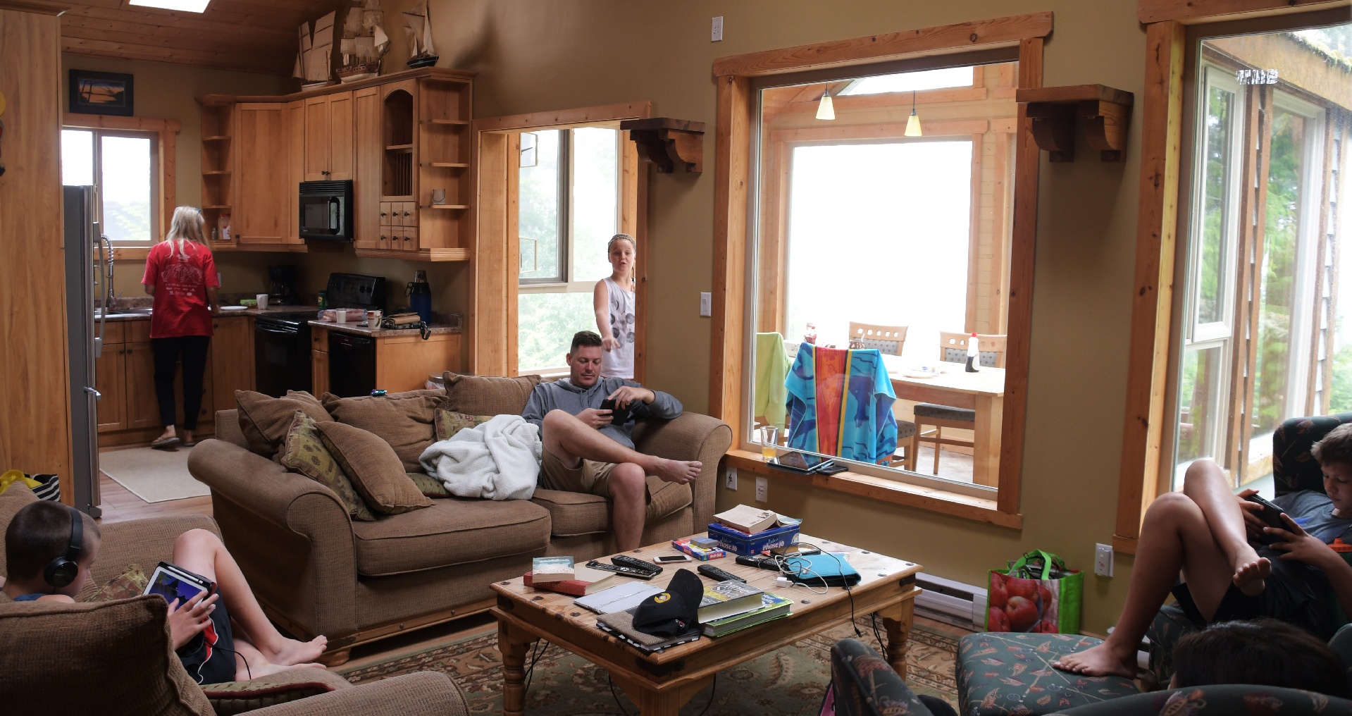 Upstairs: The guys on their electronics, and gals preparing breakfast...