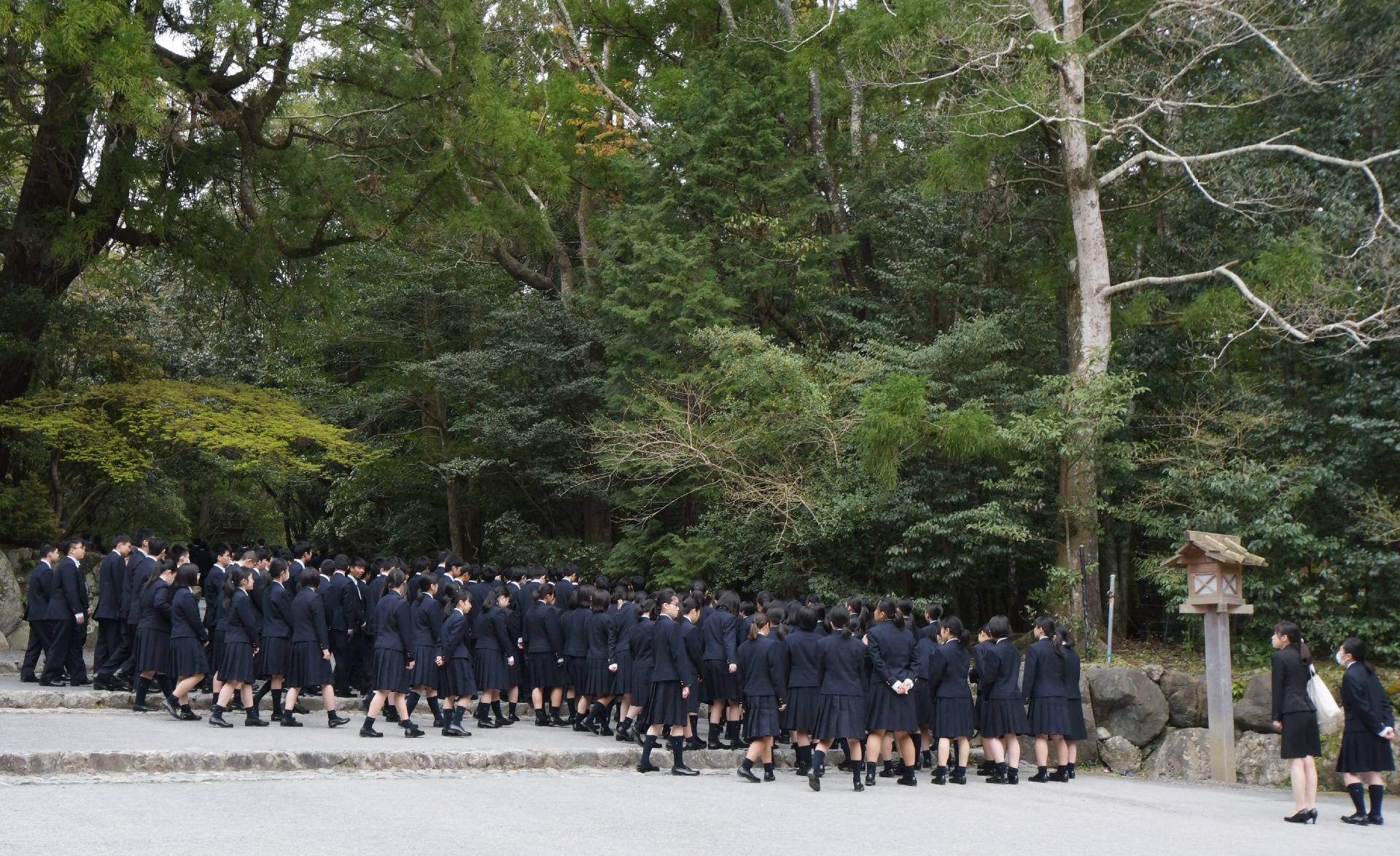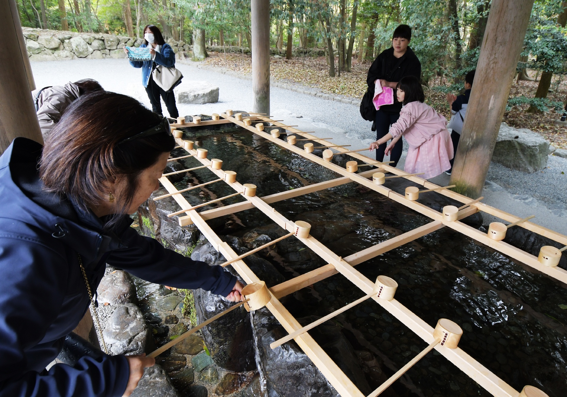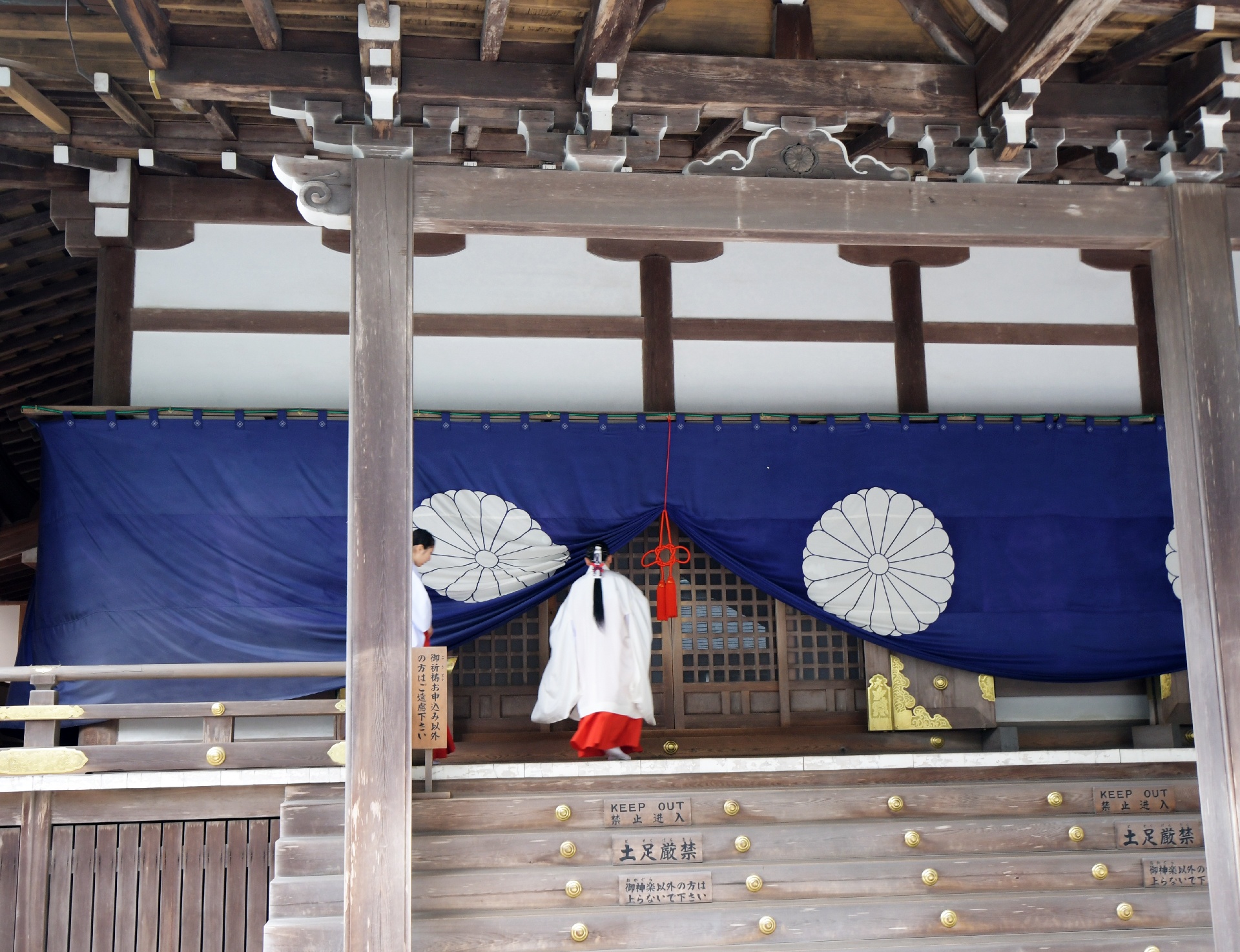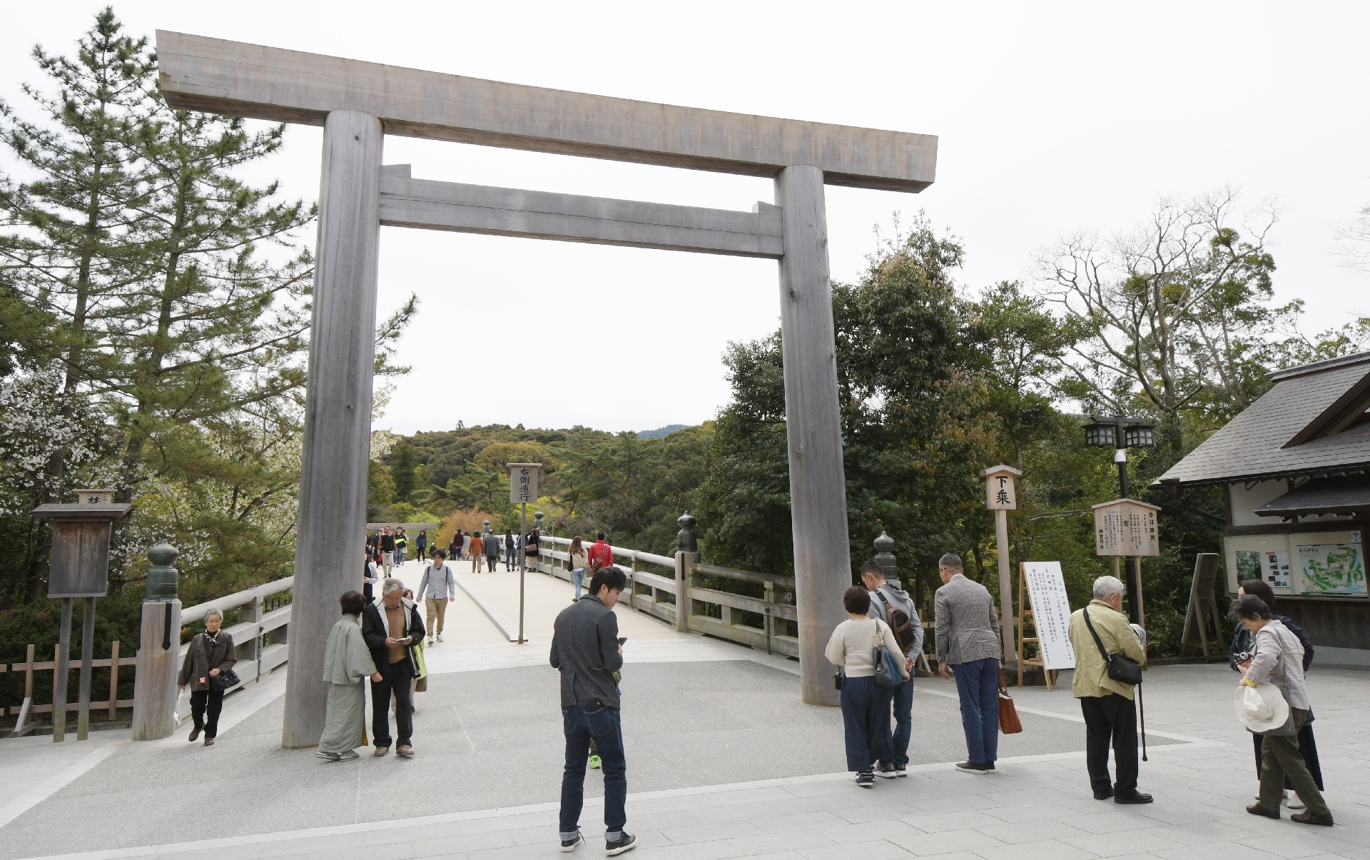 With that once-in-a-lifetime honour behind us, we approached the large entry torii, and the bridge across the river to the shrine grounds.