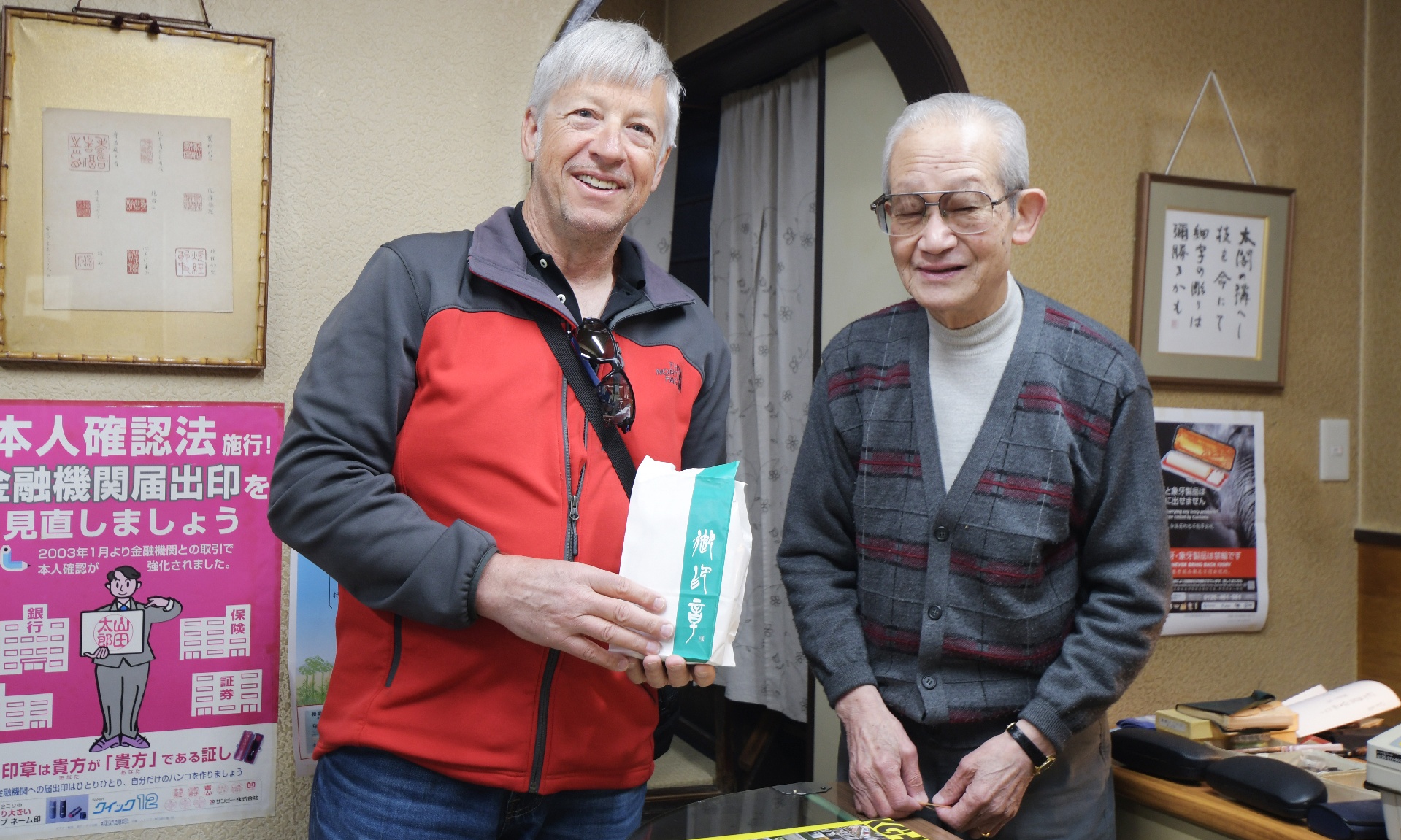 We dropped by his shop to pick up an order that we placed last week. This is near the first place we stayed. This is a hanko or inkan shop.