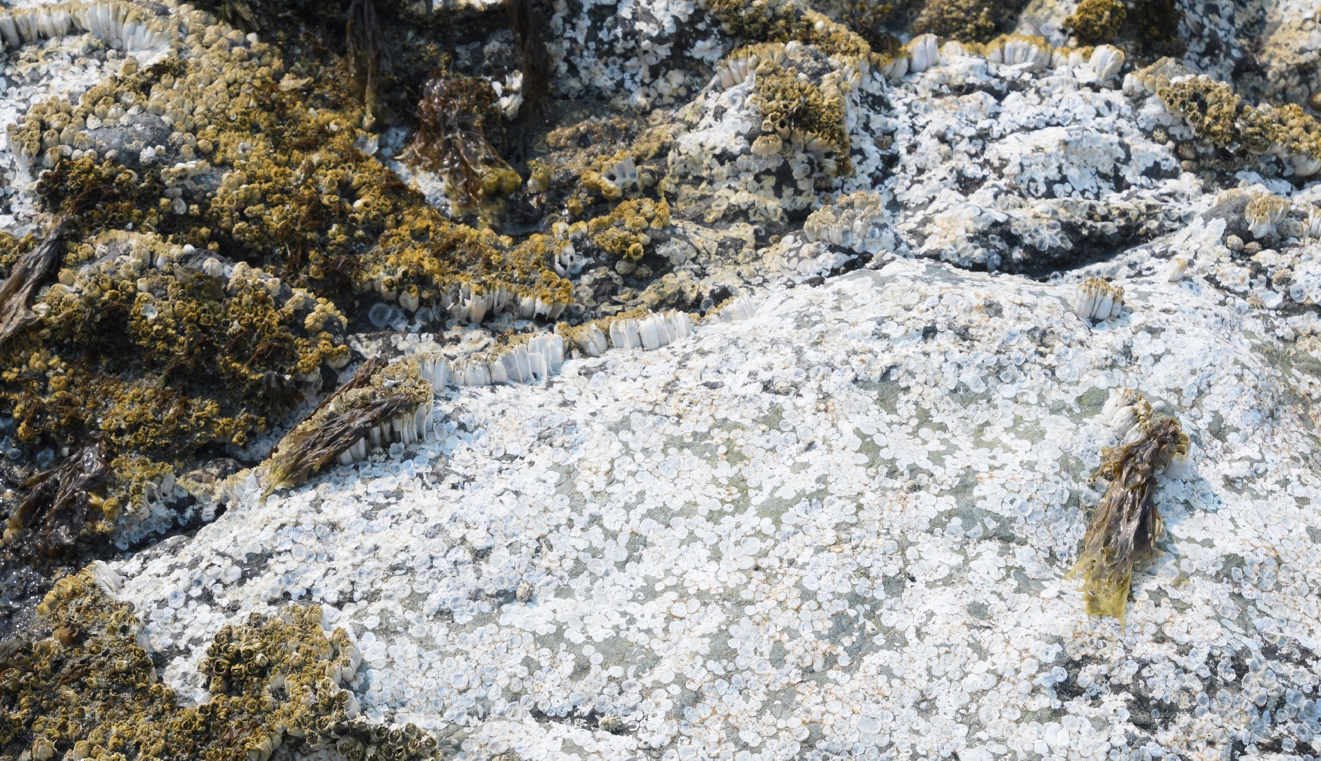 Evidence of the hot summer: the kelp is dried and dead, while the barnacles over-heated, and died, and are falling off the rocks. Makes room for the next generation!
