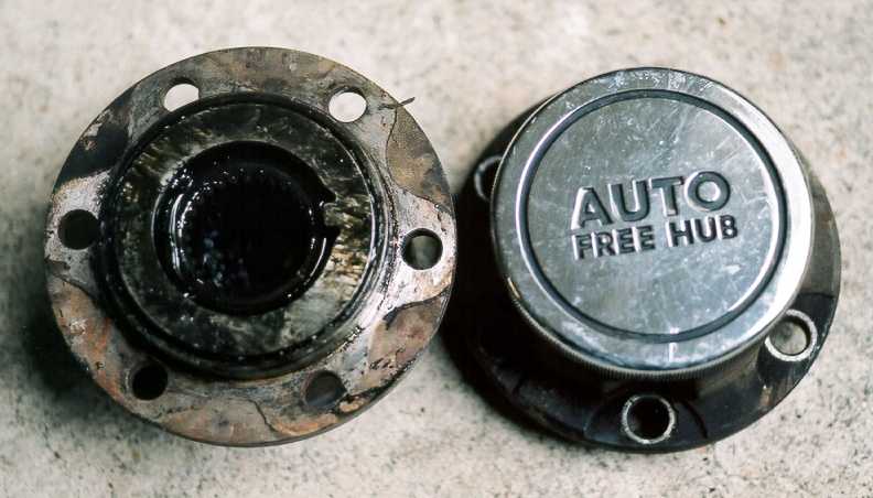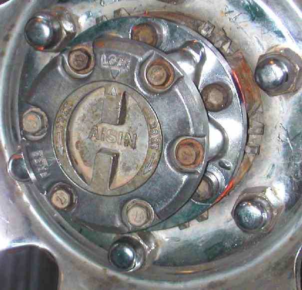 Aisin manual locking hubs, taken from a Mitsu pick-up in a Portland parts yard. Installed to avoid potential unwanted un-locking, which can occur with the auto-locking hubs.