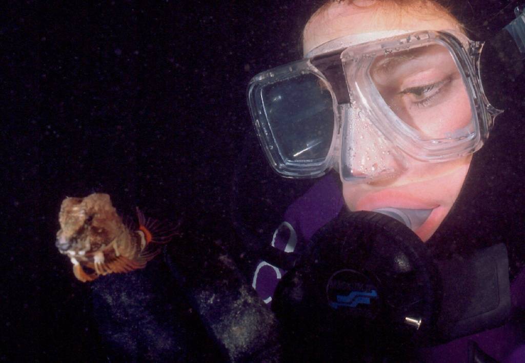 Kate, with one of the rare treats in BC, the Grunt Sculpin, a little fellow that makes a faint grunting noise. Very tame.