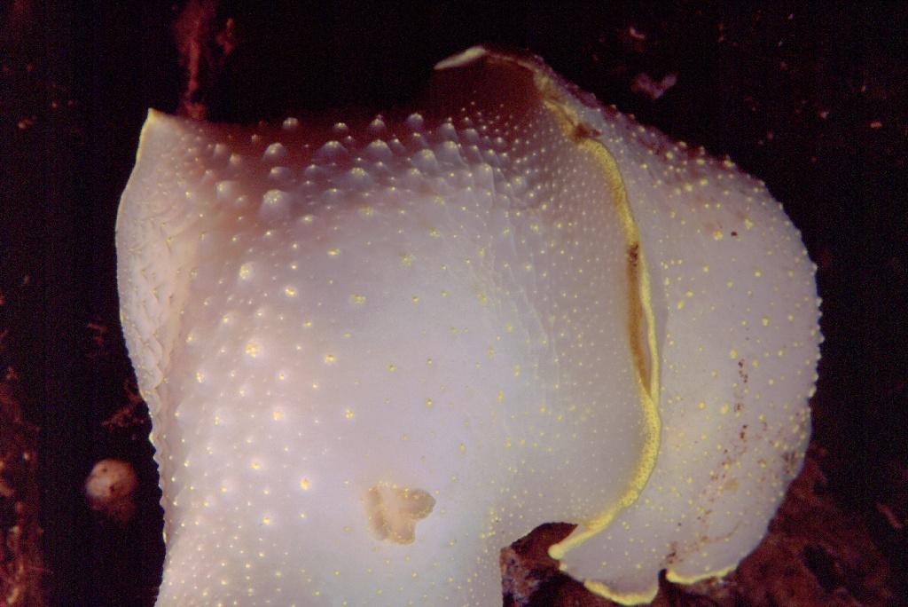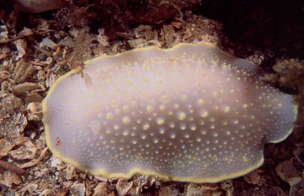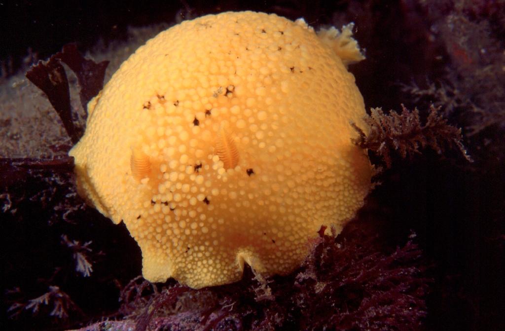 This is a Noble Sea Lemon, about 4cm wide, showing its 2 rhinophores (those 2 horn-like things), which