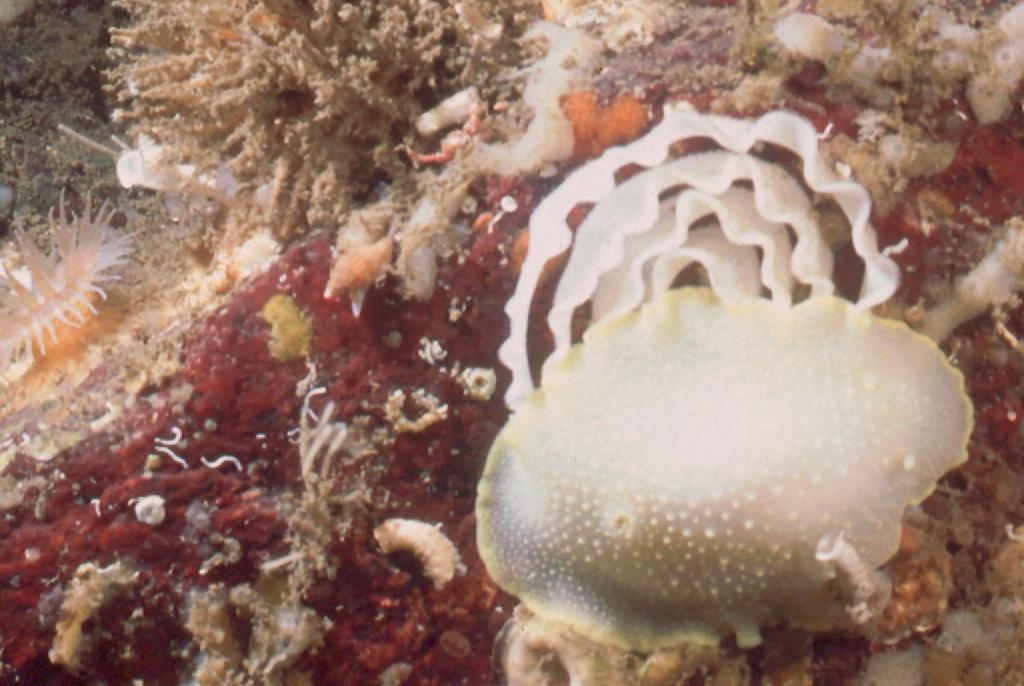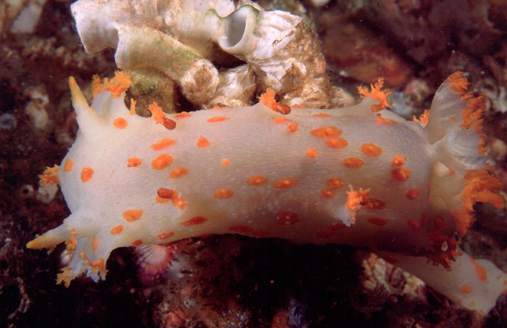 An Orange-Spotted Dorid, about 6 cm long, with rhinophores on the left, large gills on the right, cruising the tube-worm and barnacle crusted rocks.