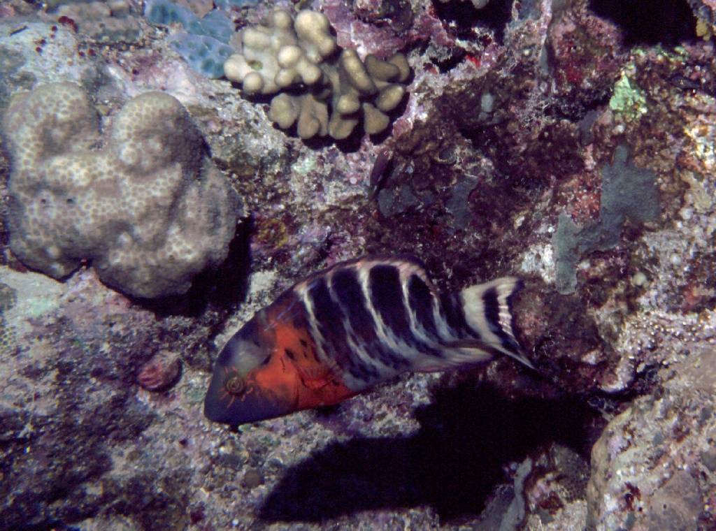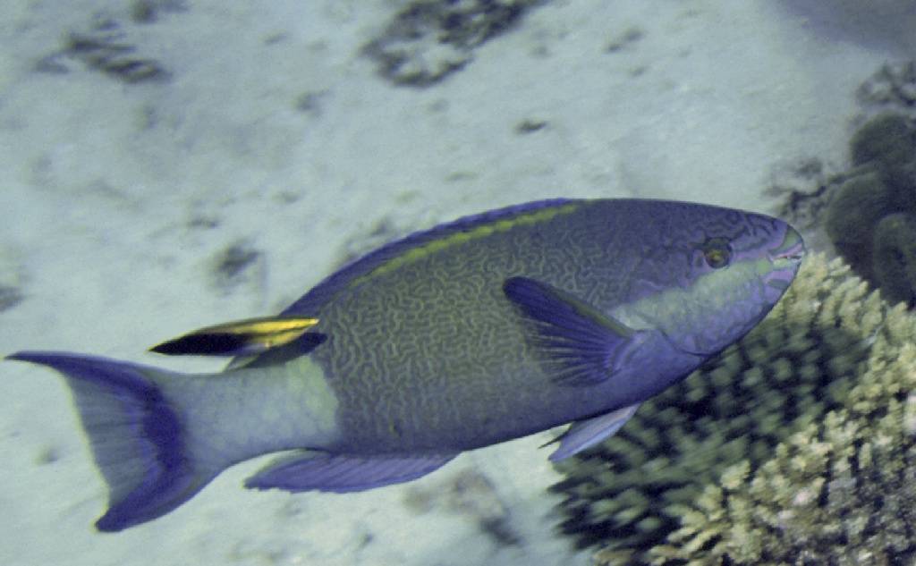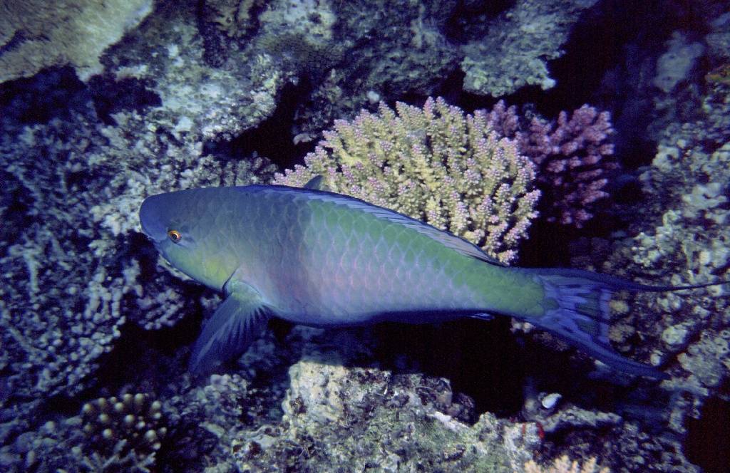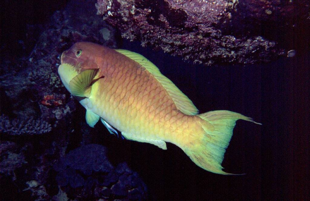 This parrotfish, a yellow version of the larger fish above, is a coral eater.